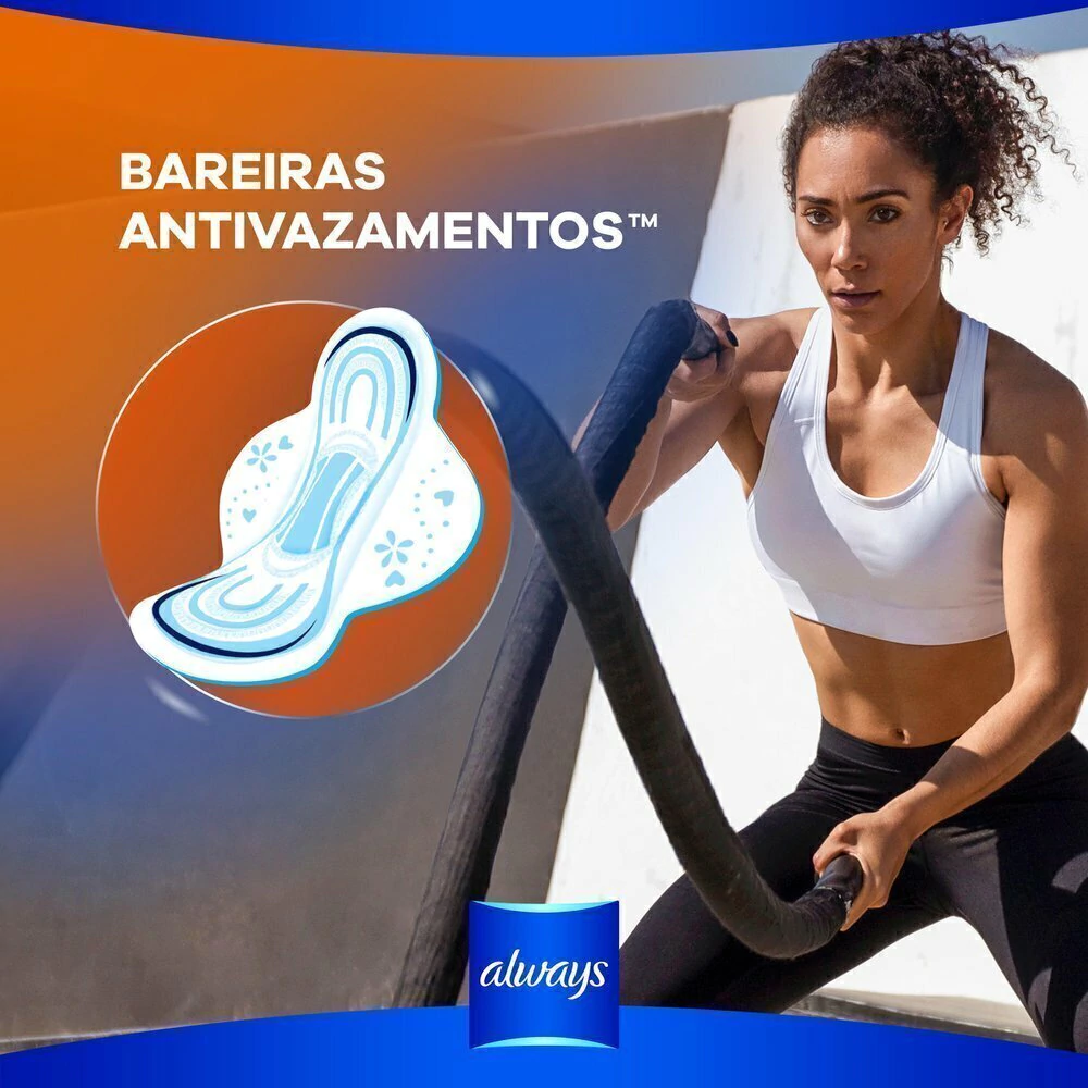 Novo Always super proteção com barreiras antivazamentos. Até 8 horas de proteção, Com cobertura seca e ajuste incrível e extra seco. Menos Trocas, Mais Economia!