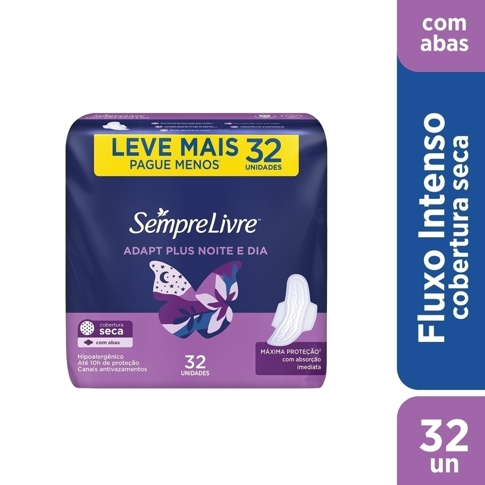 Benefícios e diferenciais - Centro elevado e canais antivazamento que garantem absorção instantânea até dos fluxos mais intensos; - Até 10h de proteção contra vazamentos; - Máxima* proteção: 5cm mais longo (*comparado com o portfólio de SEMPRE LIVRE); - Formato anatômico que se adapta ao corpo em pé ou deitado; - Tecnologia exclusiva que neutraliza odores; - Hipoalergênico e Ginecologicamente Testado; - Ultra suave: 70% de ingredientes de origem natural e livre de fragrância e corante - Cobertura Suave.