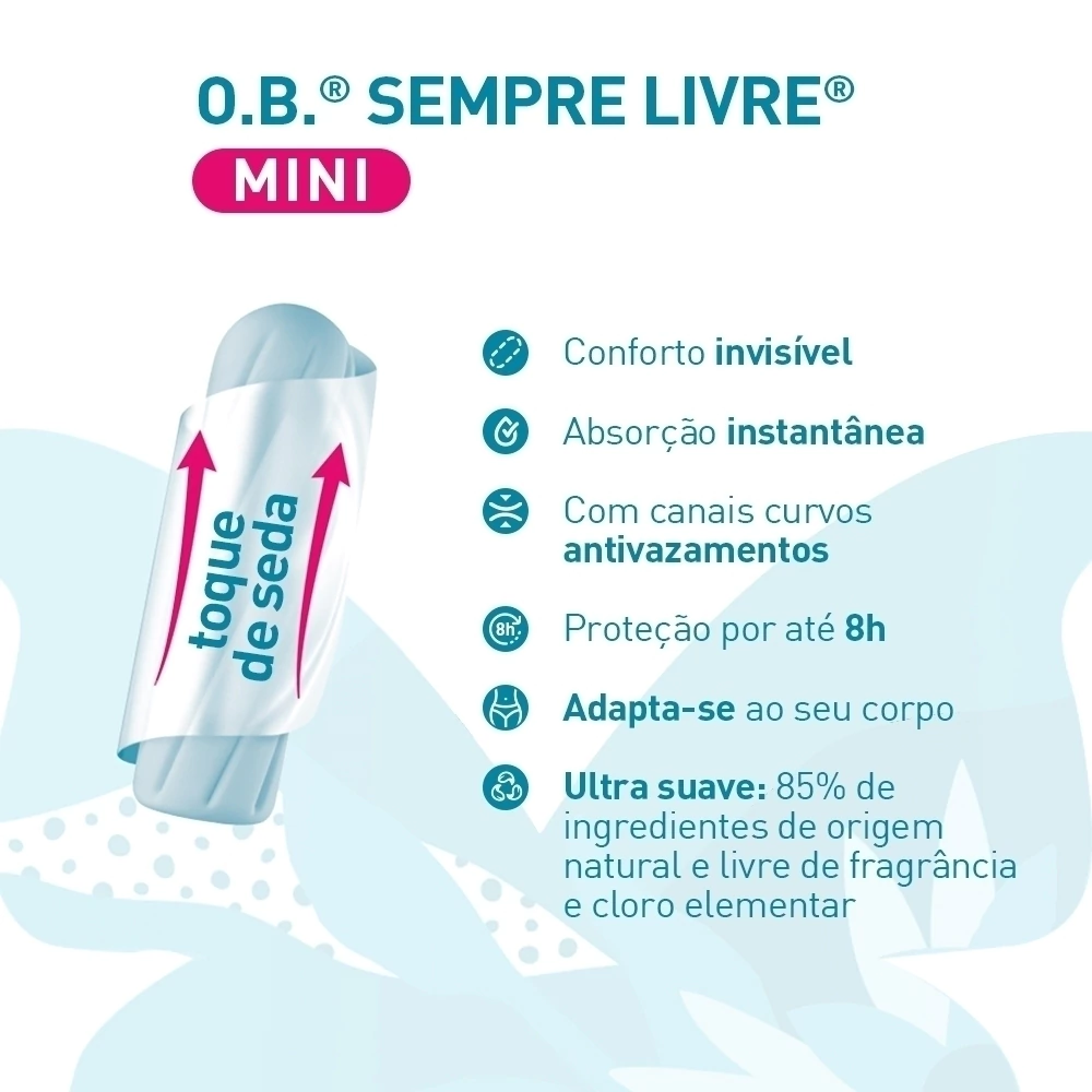 "O.B.® SEMPRE LIVRE(TM) é um absorvente interno desenvolvido por uma ginecologista para proporcionar proteção e conforto para a mulher durante o período menstrual.