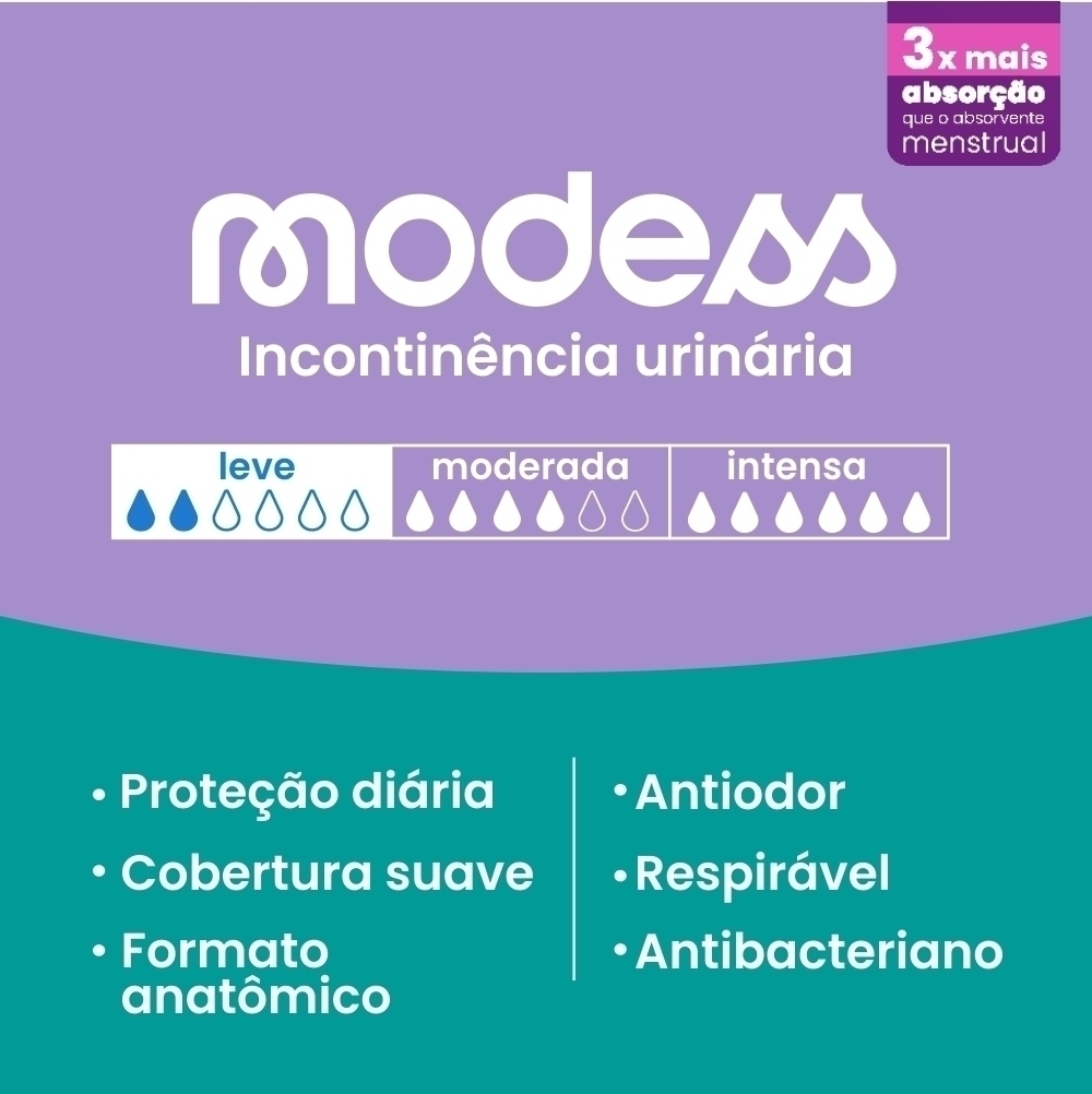 Indicado para incontinência urinária leve. Os absorventes Modess para Incontinência, foram desenvolvidos pensando no bem estar da (o) usuário (a), projetado para absorver e reter a urina, proporcionando proteção contra vazamentos, apresenta tecnologias como o filme respirável que ajuda e evitar o abafamento da pele durente o uso, tratamento antibacteriano que ajuda a reduzir o crescimento de microrganismo e antiodor que age na neutralização e controle do odor, o produto tem formato anatômico, cobertura suave e macia, queproporciona conforto durante o uso. Este produto hipoalergênico e foi testado dermatologicamente.Os produtos são válidos por 2 (dois) anos após data de fabricação se mantidos fechados em locais secos.