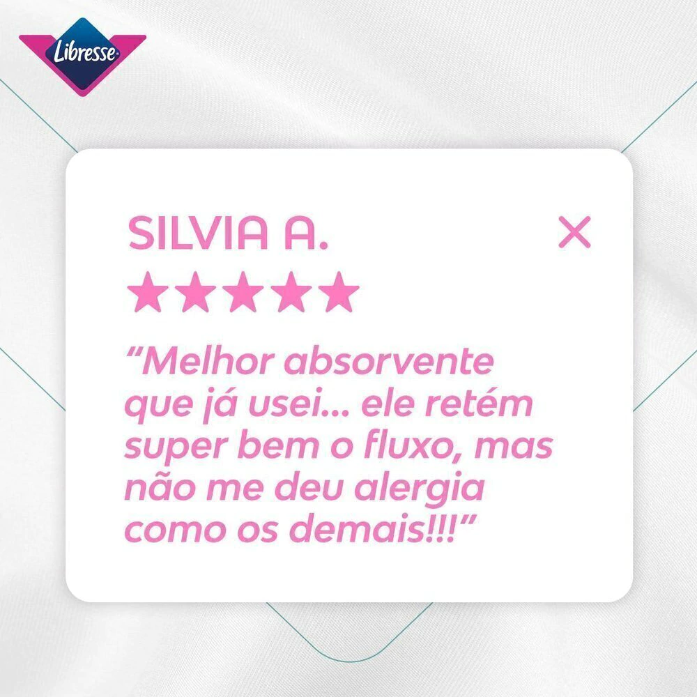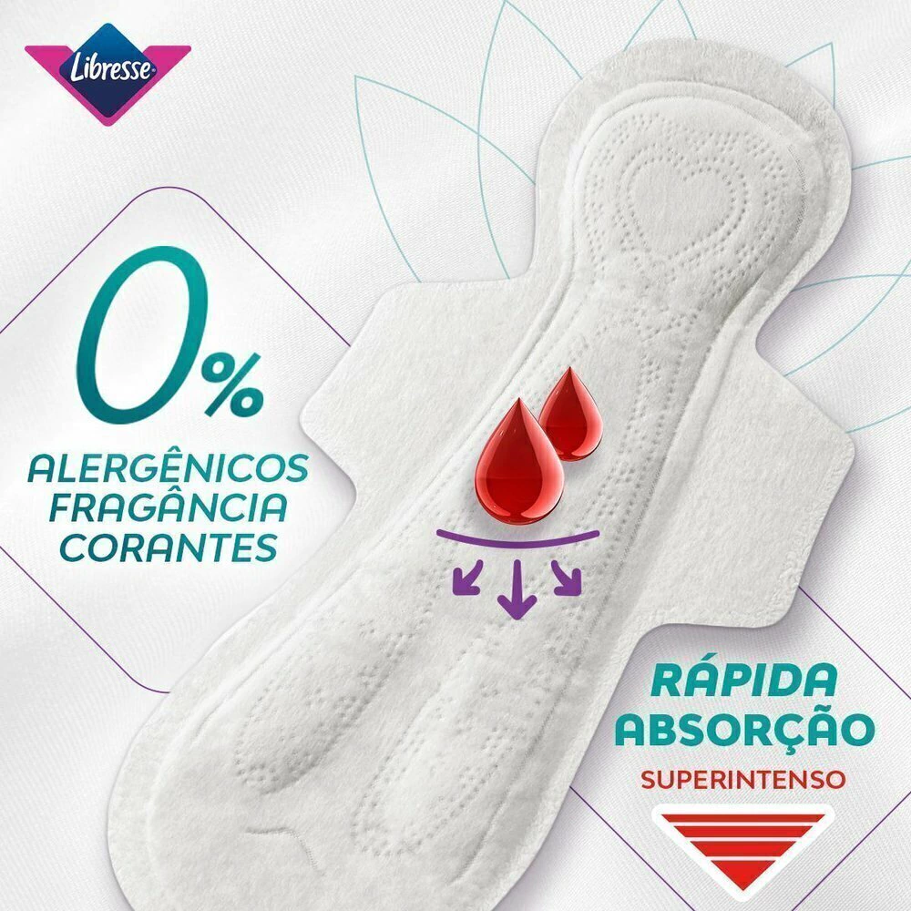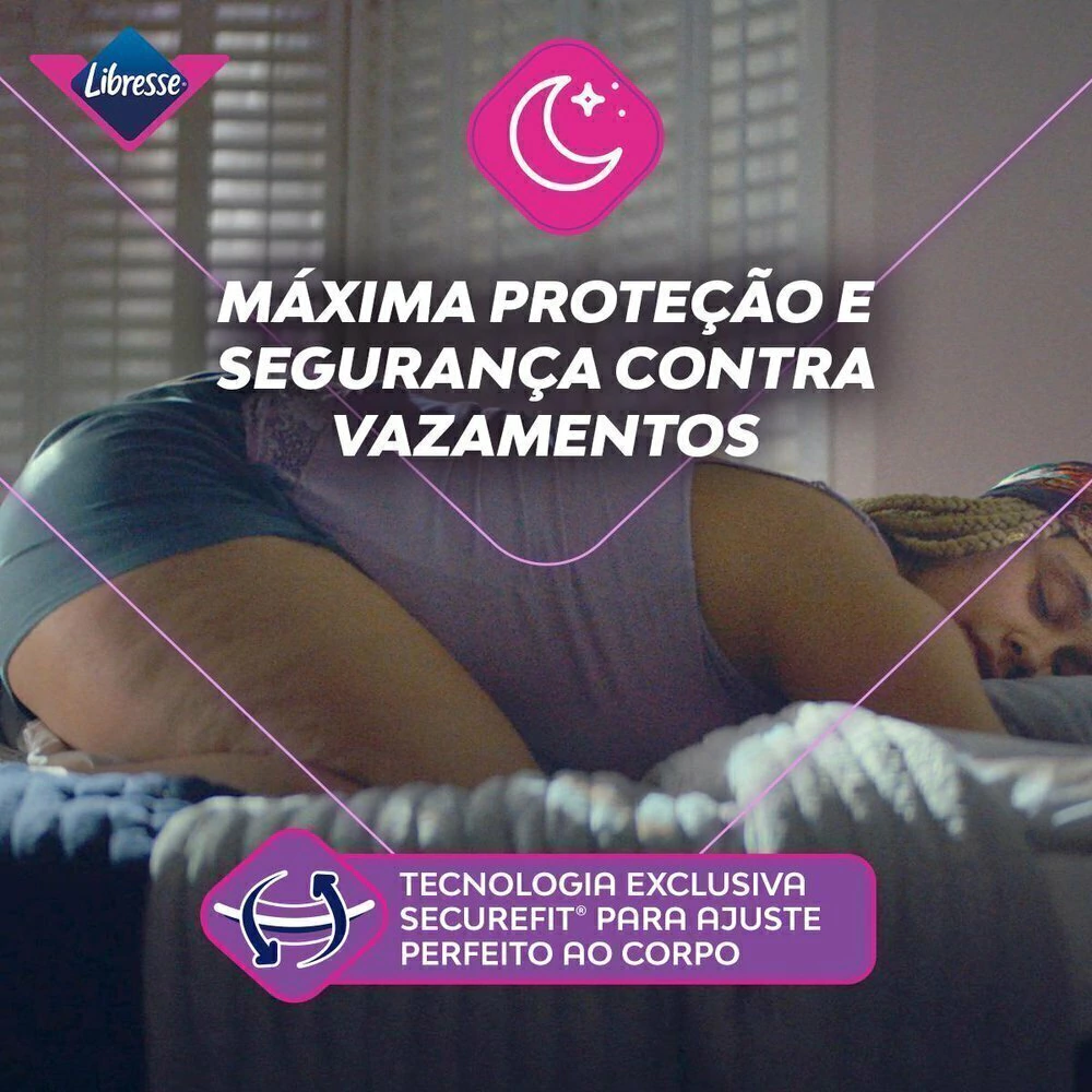 "Libresse é uma marca com uma linha completa de produtos para o ciclo menstrual. Acreditamos que o ciclo menstrual é único. Vamos surpreender e transformar a relação com a sua menstruação, oferecendo um lugar seguro sem vazamentos e desconfortos. Nossos absorventes são perfeitos para um sono tranquilo. Seu tamanho longo com 28cm centímetros é ideal para ser usado durante o fluxo intenso e superintenso. Uma noite sem preocupações. Máxima absorção, proteção, conforto e segurança durante seu período menstrual que te mantém segura por até 12 horas. Possui tecnologia exclusiva SecureFit se adapta perfeitamente ao seu corpo, é super discreto e se move com você, evitando vazamentos de deixando segura. Possui uma camada extra suave, um tecido respirável que te mantém fresca e confortável. Suas embalagens são individuais para maior praticidade e conveniência. A pele da sua Zona-V (que não é apenas a sua vagina e a sua vulva!) é a mais sensível da sua região íntima e precisa de um cuidado especial. Produto dermatologicamente testado.o Tecnologia SecureFit® - Adaptação perfeita ao seu corpo e seus movimentos evitando vazamentos; o Cobertura Suave e Respirável - Macio e confortável. Circulação do ar, mantendo a pele fresca (sem abafar), seca e saudável;o Fluxo intenso e superintenso - Garante conforto, rápida absorção e proteção;o Os componentes são atóxicos e dermatologicamente testados;o Produto hipoalergênico. "
