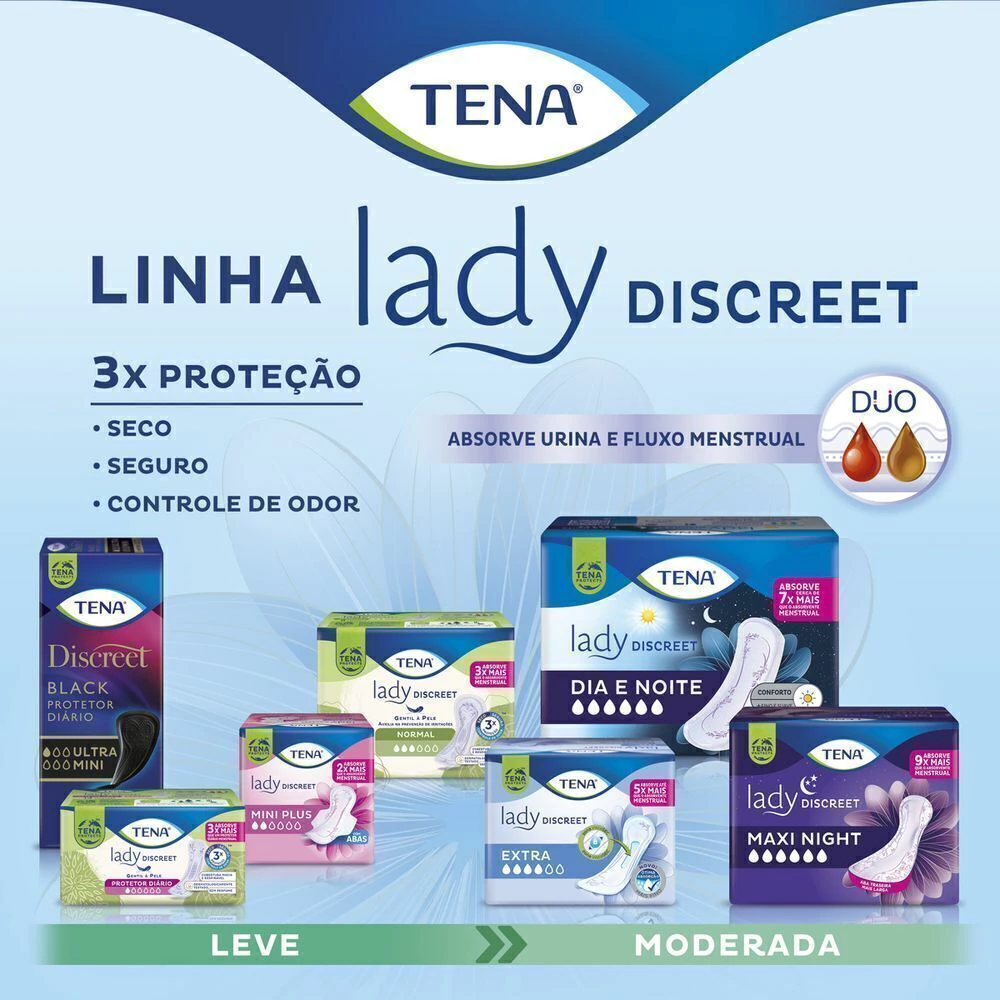 Tena Lady Discreet Dia e Noite é uma linha exclusiva para mulheres, com absorventes desenhados especialmente para perda de urina moderada. Indicado para usuárias ativas com mobilidade. Absorvente Lady Discreet Dia e Noite proporciona conforto durante o dia com seu design fino e suave ao mesmo tempo que proporciona a segurança durante a noite através do seu núcleo de alta absorção. Tena Lady é seguro, possui controle de odor e absorve cerca de 7x mais que um absorvente menstrual.