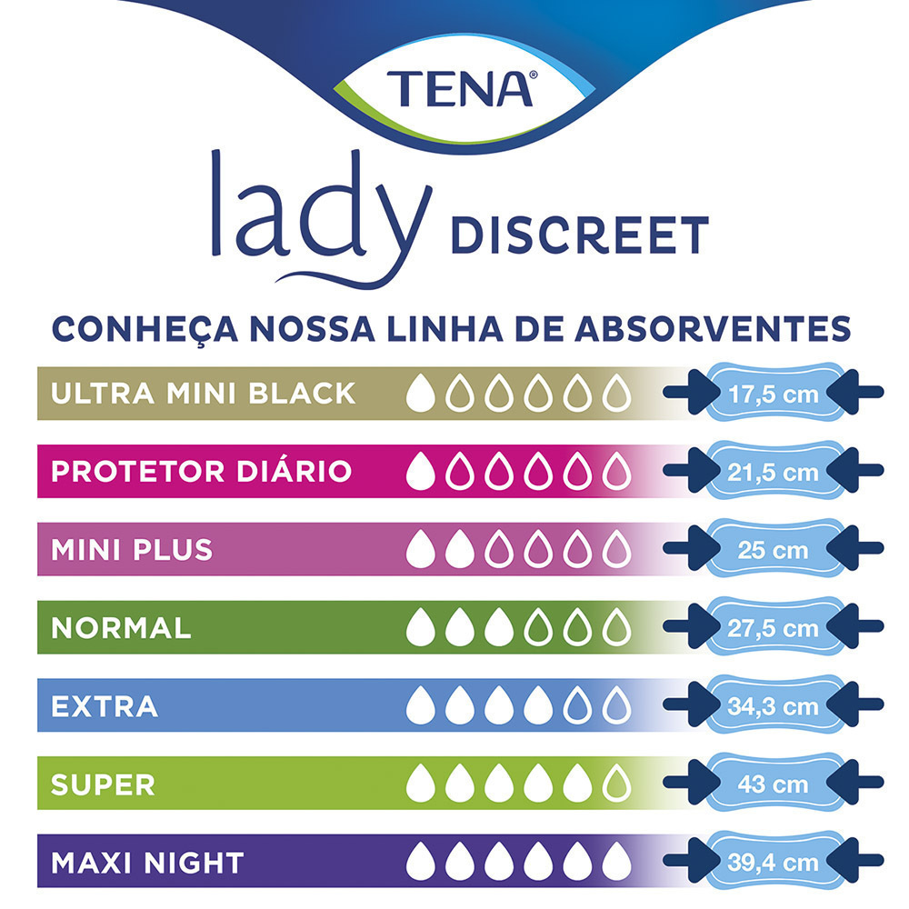 Absorvente para Incontinência Urinária TENA Lady Discreet Maxi Night Noturno faz parte da linha TENA Lady Discreet, produtos exclusivos para mulheres com incontinência urinária. Proteção diária para mulheres ativas com perda moderada de urina. TENA Lady Maxi Night foi especialmente projetado para proporcionar uma boa noite de sono. São macias e confortáveis favorecendo proteção adicional devido ao seu formato específico: são mais largas na parte de trás com maior área de cobertura e extra absorção quando deitado. o Produto que você fixa na roupa íntima, evitando que ele se desloque com o movimento; o Possui sistema Odour Control(TM) - Sistema de controle que reduz o risco de odores indesejáveis; o Dry Fast Core(TM) - Núcleo de secagem rápida que absorve e retém o líquido mais rapidamente; o Superfície com toque de tecido - Maior conforto e sensação de maciez; o Absorve 9x mais que o absorvente menstrual garante segurança e excelente proteção contra vazamentos. o Os componentes são atóxicos e pré-testados.