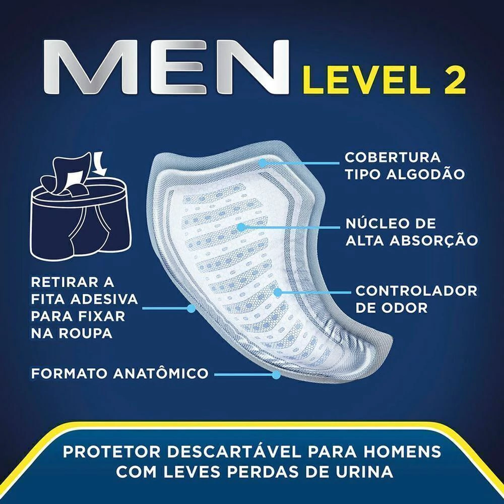 o Com tecnologia Secure Absorption - proporciona absorção segura para homens com leve a moderada perda de urina; o Núcleo ultra absorvente - retém os escapes de urina de forma eficiente; o Controle de odor - Controla e inibe odores indesejáveis; o Ajuste ao corpo - possui formato confortável adequado ao corpo masculino. o Embalagem individual e fita adesiva para fixar na roupa intima.