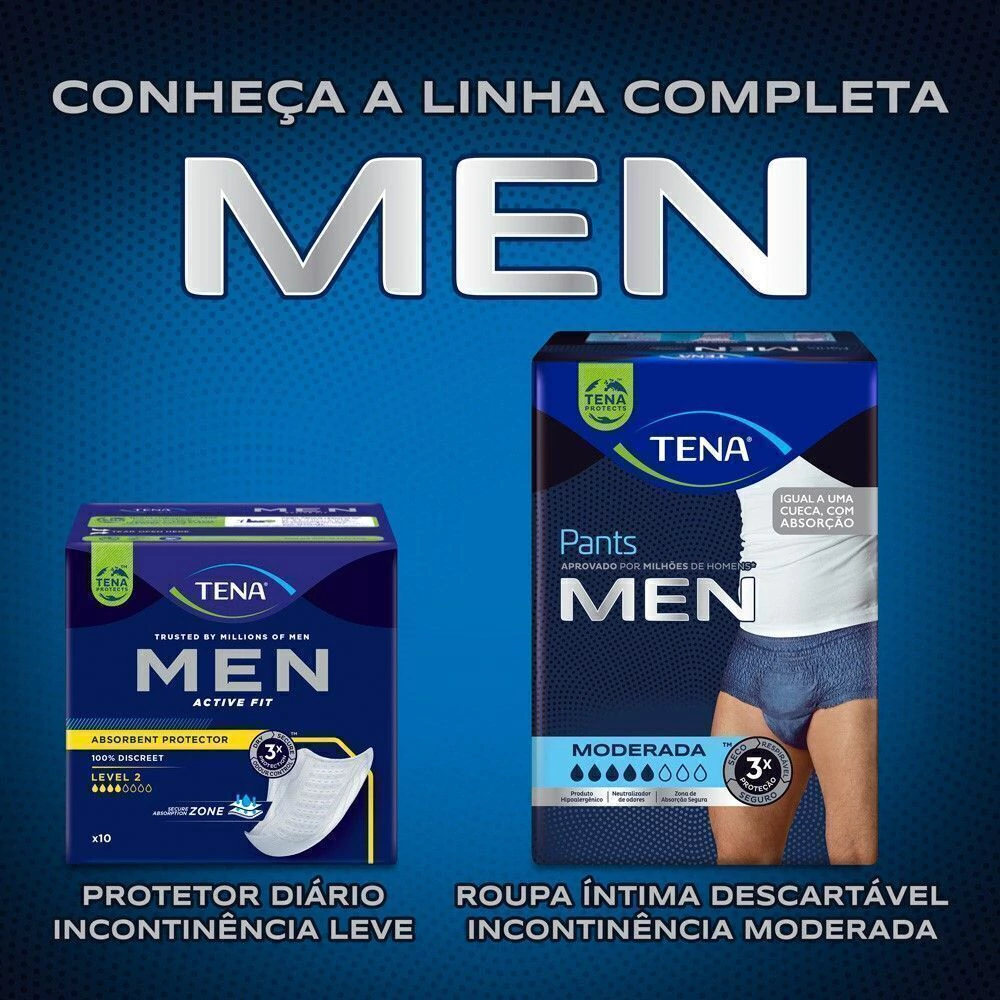 Protetor masculino TENA MEN descartável diário para homens ativos com gotejamentos de urina. Proporcionando alta e eficaz proteção, absorção e segurança para desfrutar das atividades do dia-a-dia, inclusive durante a prática de esportes.