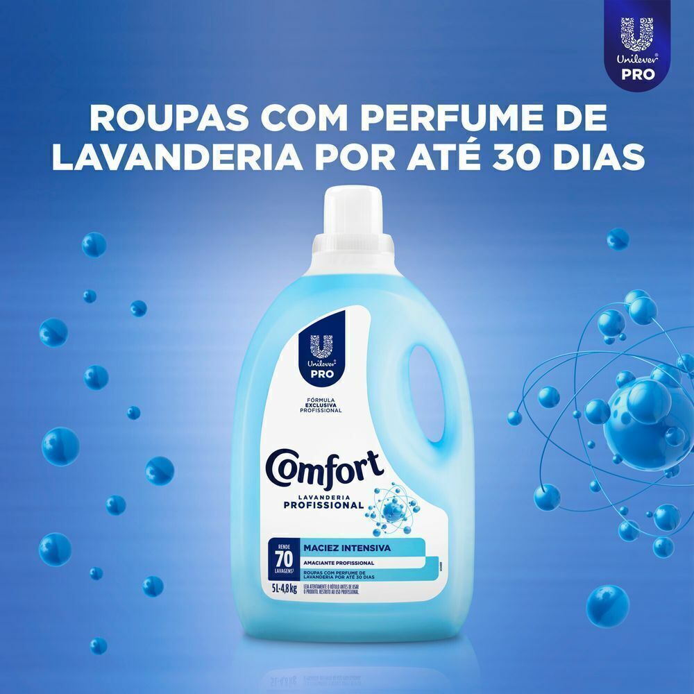 oEste amaciante profissional proporciona tratamento intensivo, penetrando facilmente nas fibras das roupas, resultando em perfeita combinação de maciez e perfume oCom cápsulas de perfume que deixam uma fragrância que dura muito tempo nas suas roupas oO Amaciante Comfort Lavanderia Profissional, além de deixar suas roupas com perfume de lavanderia por até 30 dias, faz sua roupa durar muito mais! oDesenvolvido especialmente para estabelecimentos comerciais, a linha profissional de amaciantes de roupa Comfort é ideal para seu bar, restaurante, hotéis ou motéis oO Amaciante Comfort Lavanderia Profissional Maciez Intensiva possui uma embalagem econômica de 5 L que rende 70 lavagens* de roupas macias e perfumadas