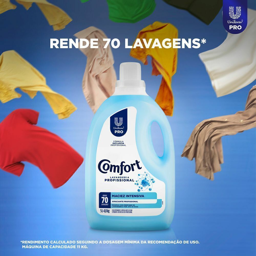 A fórmula do Amaciante Comfort Lavanderia Profissional Maciez Intensiva foi desenvolvida para garantir maciez e perfume às roupas e aos tecidos, com alto nível de ingredientes suavizantes que penetram facilmente nas fibras das roupas, quando comparado à maioria dos amaciantes regulares do mercado. Com a qualidade inigualável de Comfort, o formato Profissional trata as roupas a cada ciclo de lavagem, conferindo maciez intensiva e perfume que dura o dia todo. Possui em sua formulação tecnologia que ajuda a proteger as peças contra os sinais de envelhecimento dos tecidos: previne a formação de bolinhas, mantém a elasticidade das roupas, previne os danos antes que eles aconteçam, evita esgarçamento, protege as cores e mantém o brilho das roupas. Além de fazer sua roupa durar mais, o Amaciante Comfort Lavanderia Profissional Maciez Intensiva deixa suas roupas com perfume de lavanderia por até 30 dias. Este material de limpeza ainda conta com um ótimo custo-benefício: uma vez ajustada a dosagem de acordo com as recomendações de uso, a embalagem econômica de 5 litros rende até 70 lavagens* de roupas macias e tratadas. É também um produto mais sustentável, que reforça o compromisso da Unilever por um planeta mais limpo: possui embalagem reciclável e ingrediente ativo biodegradável em sua formulação.