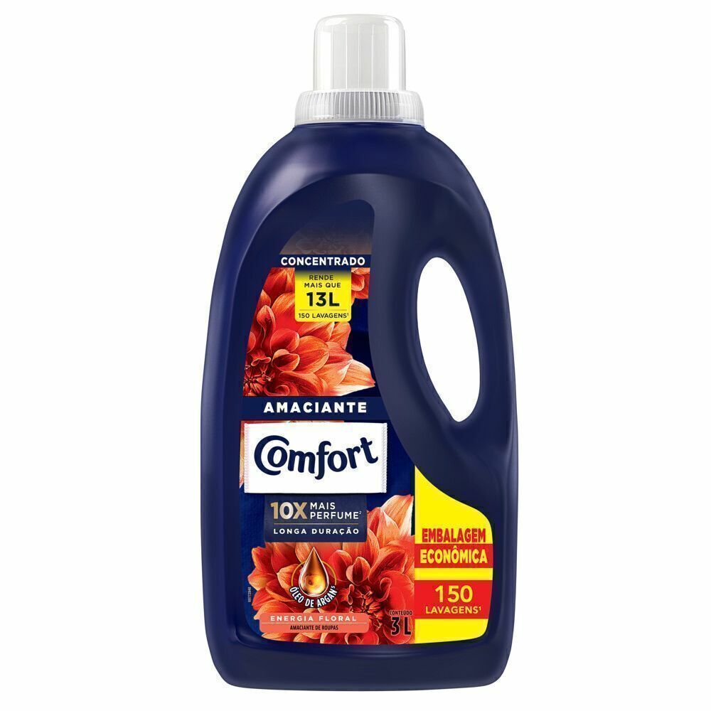 o O Amaciante Concentrado Comfort Energia Floral proporciona 10x mais perfume**, contém óleo de argan***** e cápsulas de perfume que garantem uma fragrância intensa e duradoura para suas roupas o O Amaciante Concentrado Comfort Energia Floral tem ótimo rendimento, menos de meia tampinha basta na sua lavagem*! Rende mais que 13 Litros e 150 lavagens* o O Amaciante Concentrado Comfort Energia Floral possui óleo de argan*****, que cuida intensamente das suas roupas enquanto as perfuma por muito tempo o Esse amaciante de roupa possui cápsulas de perfume para roupas que blindam contra o mau odor**** e perfumam sua lavanderia o Comfort previne suas peças dos danos da lavagem de roupa, mantendo as cores*** dos tecidos vibrantes e evitando a formação de bolinhas*** e esgarçamento*** o Comfort pensa nas suas roupas e no meio ambiente! Além de ser concentrado, sua garrafa e tampa são feitas de plástico 100% reciclado e reciclável