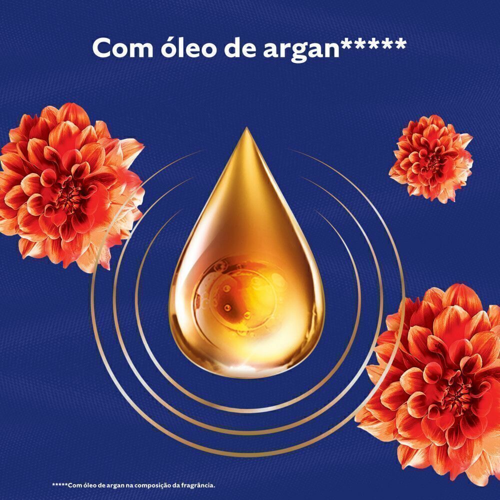 **Teste analítico com 22,5 ml de produto comparado com marca diluída, sem perfume encapsulado do mesmo fabricante. ***Benefícios de tratamento do amaciante obtidos versus roupas lavadas sem amaciante. ****Baseado em testes realizados com odores representativos. *****Com óleo de argan na composição da fragrância.