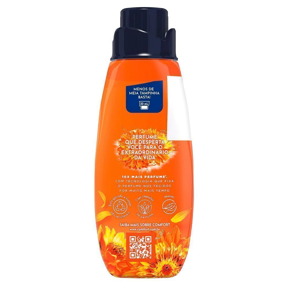 O Amaciante Concentrado Comfort Energia Floral tem 10x mais perfume** de longa duração, por isso deixa suas roupas perfumadas por muito mais tempo. Sua formulação incrível possui cápsulas de perfume que são liberadas durante a lavagem para deixar uma fragrância duradoura nas suas roupas e blindar o tecido contra o mau odor****. O amaciante de roupa Comfort concentrado possui perfume encapsulado que penetra no tecido durante o processo de lavagem, deixando sua roupa muito mais cheirosa até mesmo depois de seca! O motivo? Quando você se movimenta, essas cápsulas de perfume para roupas se rompem e liberam essa fragrância incrível, fazendo com que aquele cheirinho de roupa lavada dure muito mais! Além disso, sua fórmula contém óleo de argan*****, um óleo natural com alto potencial nutritivo, que perfuma e trata suas roupas, prevenindo os danos da lavagem, mantendo as cores*** do tecido vibrantes por mais tempo, evitando a formação de bolinhas*** e esgarçamento***. Comfort te oferece tudo isso com um ótimo rendimento, por ser concentrado, menos de meia tampinha basta* rende muito! Além de cuidar e perfumar suas roupas, o amaciante concentrado Comfort cuida do meio ambiente, sua garrafa e tampa são feitas com plástico 100% reciclado e reciclável. O Amaciante Concentrado Energia Floral cuida das suas roupas, pois possui ingredientes capazes de alinhar e proteger o tecido, reduzindo o atrito entre as fibras durante o processo de lavagem, evitando futuros danos nas peças. *Considerando recomendação de dosagem para máquinas até 8 kg (20 ml). **Teste analítico com 22,5 ml de produto comparado com marca diluída, sem perfume encapsulado do mesmo fabricante. ***Benefícios de tratamento do amaciante obtidos versus roupas lavadas sem amaciante. ****Baseado em testes realizados com odores representativos. *****Com óleo de argan na composição da fragrância.