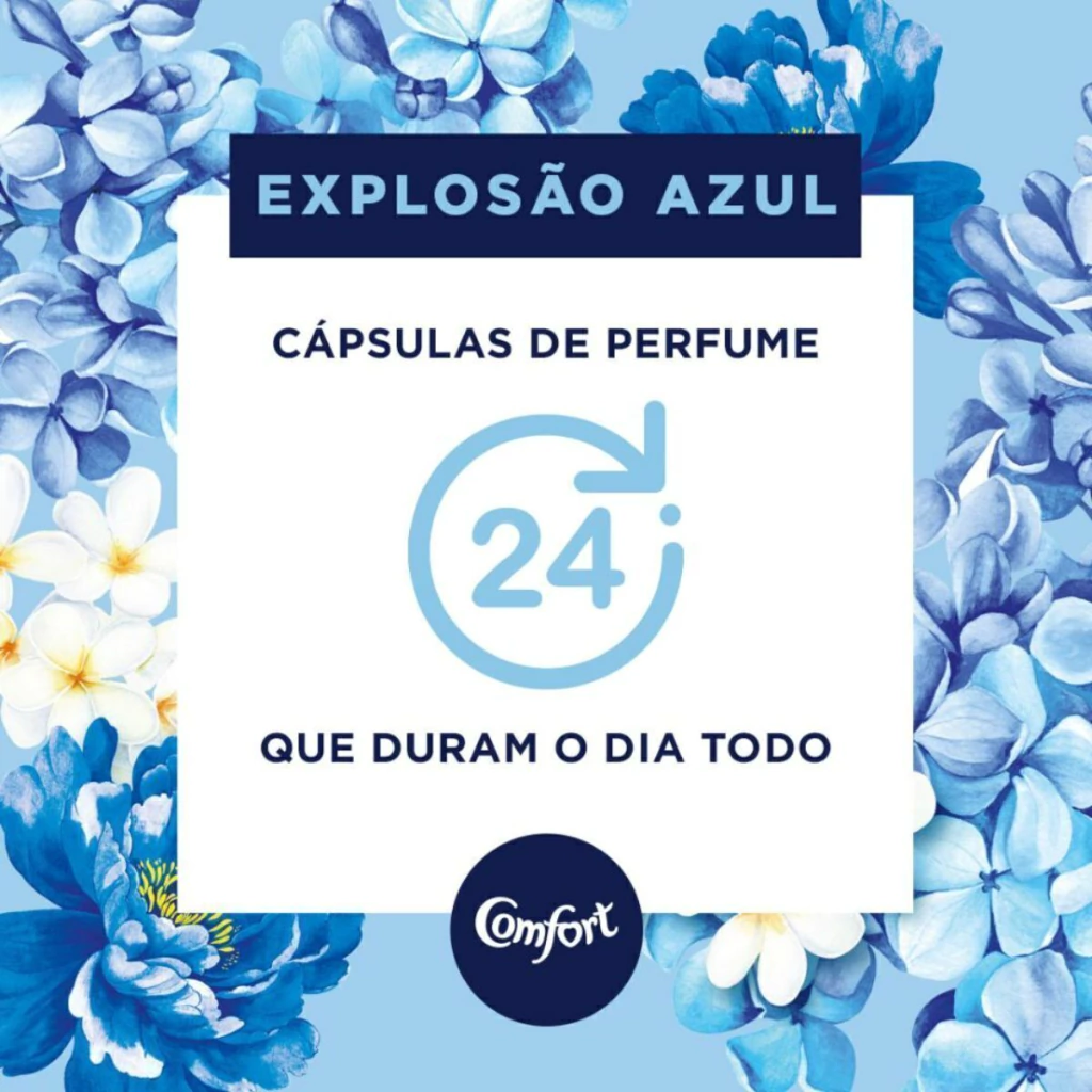 O Amaciante Diluído Comfort Tradicional Explosão Azul foi pensado especialmente para deixar as roupas macias, com perfume inesquecível e prolongado. A sua nova fórmula contém cápsulas de perfume que deixam as roupas com cheirinho de lavadas durante o dia todo. É a fragrância tradicional e duradoura de Comfort que você já conhece, agora com toque de baunilha e em tamanho maior de 3 litros. O Amaciante Diluído Comfort Tradicional Explosão Azul tem o perfume clássico de Comfort e garante maciez para as roupas de toda a família, deixando-as mais leves e confortáveis de usar. O uso do amaciante de roupas Comfort diluído deixa as suas peças mais macias, fáceis de passar e perfumadas. O amaciante Comfort protege as fibras do desgaste natural do uso das roupas e deixa as peças com toque suave e perfume duradouro. Usar o amaciante Comfort na hora de lavar suas roupas é muito simples: consulte a quantidade recomendada na embalagem e, dosando o amaciante conforme indicado, despeje a quantidade de produto dentro do compartimento de sua máquina de lavar. Em seguida, escolha o ciclo de lavagem desejado. Se preferir, o Amaciante Diluído Comfort Tradicional Explosão Azul também pode ser usado na lavagem das suas roupas no tanque.