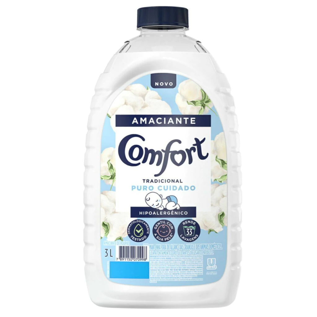 O Amaciante Diluído Comfort Tradicional Puro Cuidado foi desenvolvido com fórmula extra suave, é seguro para as roupas do seu bebê e também para as roupas de pessoas com pele delicada. Sua fórmula é hipoalergênica e dermatologicamente testada. O Amaciante Diluído Comfort Tradicional Puro cuidado tem a fragrância suave que você já conhece, agora em tamanho maior de 3 litros. Gentil com suas roupas e com sua pele, o Amaciante Diluído Comfort Puro Cuidado garante maciez para as roupas de toda a família, inclusive as roupinhas dos bebês, deixando-as mais leves e confortáveis de usar. Com o toque suave, o amaciante de roupas Comfort Diluído Puro Cuidado deixa as suas peças mais fáceis de passar e suavemente perfumadas. O Amaciante Diluído Comfort Tradicional Puro Cuidado cuida das roupas com carinho, deixando as peças com perfume delicado e toque macio. Usar o amaciante Comfort na hora de lavar suas roupas é muito simples: consulte a quantidade recomendada na embalagem e, dosando o amaciante conforme indicado, despeje a quantidade de produto dentro do compartimento de sua máquina de lavar. Em seguida, escolha o ciclo de lavagem desejado. Se preferir, o Amaciante Diluído Comfort Tradicional Puro Cuidado também pode ser usado na lavagem das suas roupas no tanque.