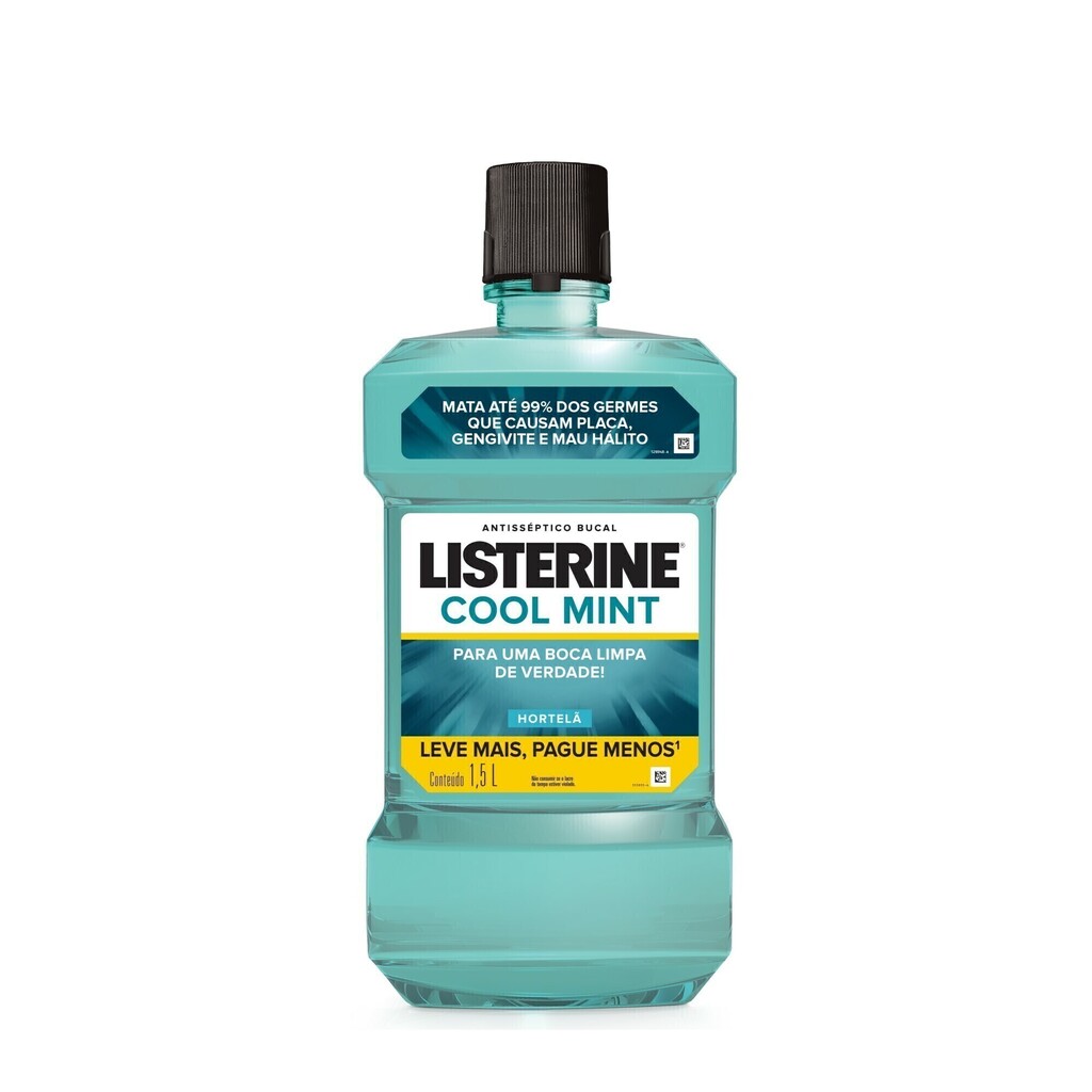 O que é e para que serve? Você sabia que os dentes são apenas 25% da sua boca? Por isso, apenas a escovação não garante uma limpeza completa. Adicione LISTERINE® Cool Mint Enxaguante Bucal, 1,5L à sua rotina e limpe aonde a escova não alcança, eliminando até 99% dos germes* causadores de mau hálito, placa bacteriana e gengivite. Inclua LISTERINE® e limpe até 100% da sua boca. Benefícios e diferenciais-Mais proteção contra mau-hálito, placa e gengivite*. *vs. somente escovação-Fórmula exclusiva com agentes antibacterianos-O enxaguante n°1 do mundo-Mata até 99,9% dos germes que causam os principais problemas bucais-Refrescância suave -Produto 100% reciclável (frasco e tampa) e feito com 30% de plástico reciclado-24 horas de proteção com o uso a cada 12 horas-Especialista em enxaguante bucal há mais de 140 anos Como usar Utilize 2x ao dia, por 30 segundos, após a escovação e uso do fio dental. Para maiores de 12 anos, faça bochechos com 20 mL; e de 6 a 12 anos, utilize 10 mL. NÃO DILUIR. Composição LISTERINE possui fórmula clinicamente comprovada com 4 poderosos agentes antibacterianos, sendo eles Salicilato de metila, eucaliptol, timol e mentol. Aqua/água purificada, Sorbitol, Propylene Glycol/propilenoglicol, Sodium Lauryl Sulfate/laurilsulfato de sódio, Poloxamer 407/poloxaleno, Eucalyptol/eucaliptol, Benzoic Acid/ácido benzoico, Sodium Benzoate/benzoato de sódio, Methyl Salicylate/salicilato de metila, Thymol/timol, Sodium Saccharin/sacarina sódica, Menthol/levomentol, Aroma (d-Limonene/dextrolimoneno), Sucralose e corante CI 42053/verde rápido 143. Precauções Não engolir. Em caso de ingestão procure assistência médica. Se houver irritação dos tecidos moles da boca ou hipersensibilidade dentária, suspenda o uso do produto e consulte um dentista. Não utilizar mais de 2x ao dia. Manter fora do alcance de crianças. Não administrar para menores de 6 anos. Deve ser aplicado por adulto ou sob sua supervisão. Armazenar em local fresco e ao abrigo de luz solar direta. Baixas temperaturas podem alterar a aparência do produto sem afetar suas propriedades. Evite contato com os olhos. Não indicado para pessoas com hipersensibilidade aos ingredientes da fórmula.