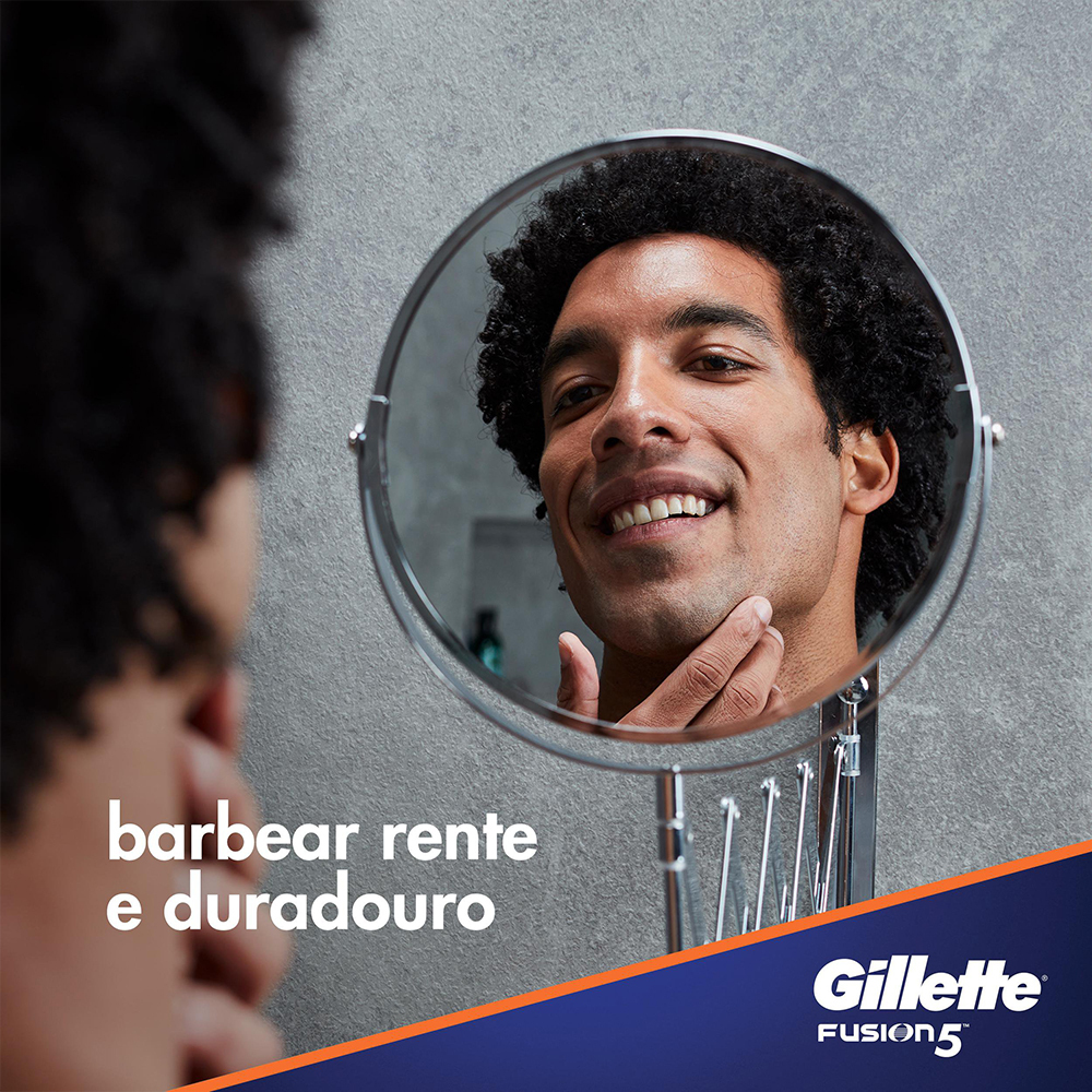 Aparelho de Barbear Gillette Fusion 5 Você quer um barbear mais confortável com menos irritação?A Gillette Fusion tem 5 lâminas para maior conforto ao barbear.Além da lâmina de precisão, perfeita para lugares de difícil acesso, como as costeletas e sob o nariz. Além disso, sua faixa de lubrificação fica branca, indicando quando o barbear não é mais ideal. • 5 lâminas para um barbear mais confortável. • Melhoria na faixa de lubrificação com aloe, vitamina. • Ação de pivotamento aprimorada. • Revestimento de faca aprimorado. • Capa mais avançada. • Barbear mais confortável e com menos irritação comparado com Mach3. • Microtensores flexíveis. • Folha de precisão.*Compre Produtos Gillette.