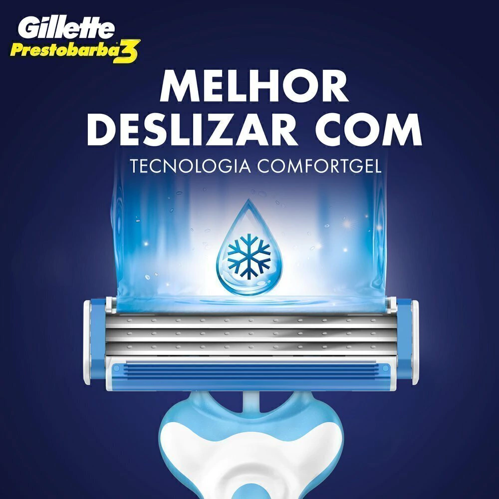 O aparelho de barbear descartável Gillette Prestobarba3 Cool agora com até mais 10 shaves refrescantes com a tecnologia comfortgel. Durante o barbear a água ativa o lubrificante, é estendida, tornando-se uma camada protetora entre a pele e as lâminas para um barbear liso e enxuto. Experimente a Espuma de Barbear Prestobarba para um melhor barbear. Até 10 barbas mais suaves;Tecnologia Comfortgel para um barbear suave e flush;Um barbear mais refrescante;Três lâminas (3) montadas em molas independentes e uma cabeça móvel que se ajusta ao contorno do seu rosto para obter um barbear suave;Cabo antiderrapante para um ótimo controle;Fácil de enxaguar.