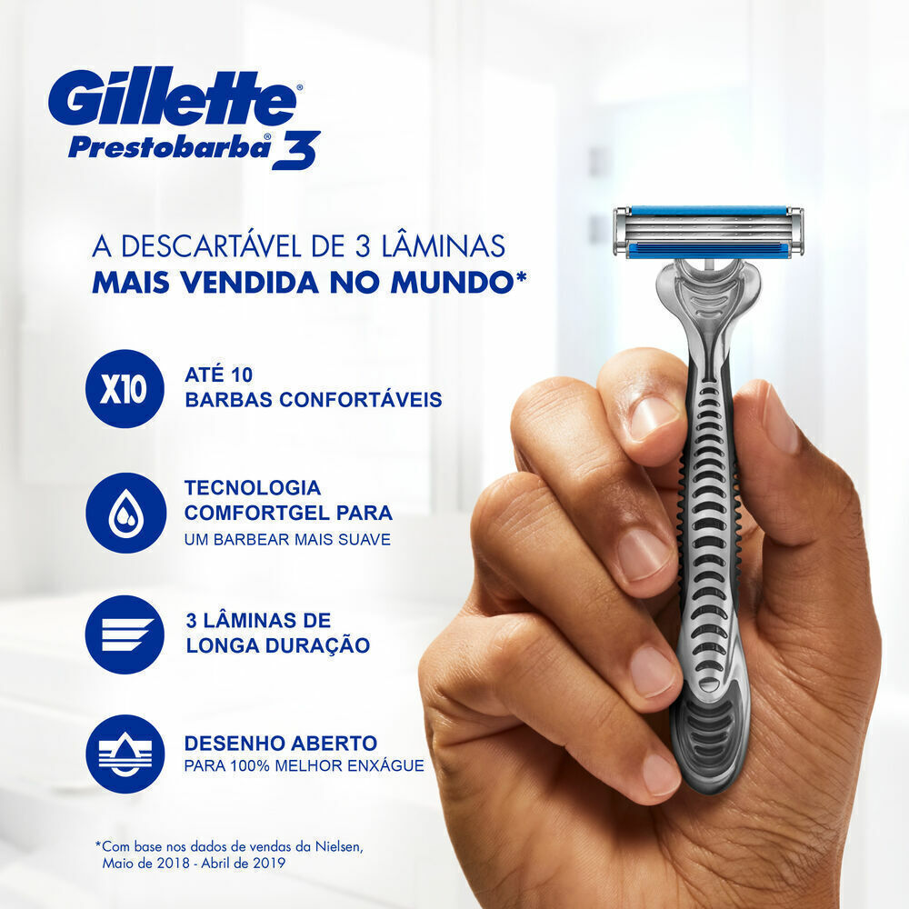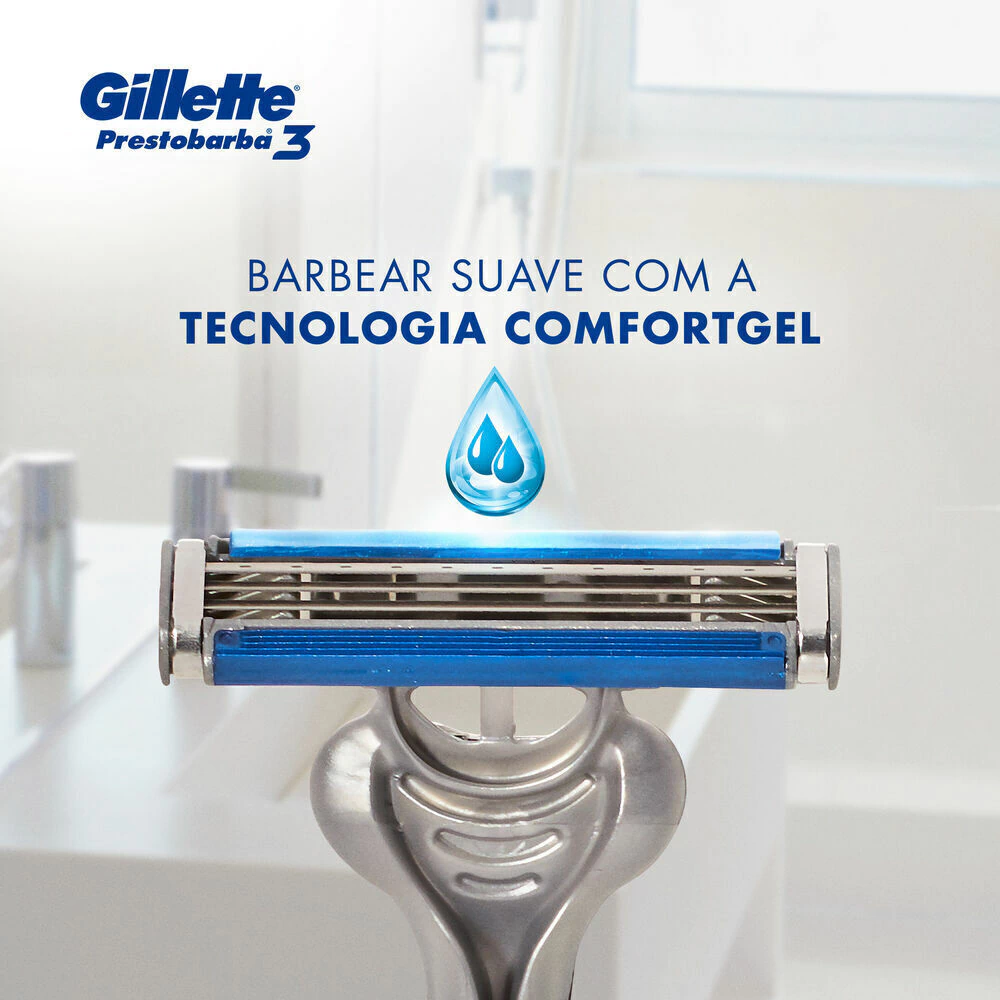 A lâmina descartável Gillette Prestobarba3 agora oferece até 10 soft shaves com sua nova tecnologia Comfortgel. Durante o barbear a água ativa o lubrificante, estende-se, tornando-se uma camada protetora entre a pele e as lâminas, para um barbear liso e flush. Para um melhor barbear, experimente a Espuma de Barbear Prestobarba. Até 10 barbas mais suavesTecnologia Comfortgel para um barbear suave e flushTrês lâminas (3 *) montadas em molas independentes e uma cabeça móvel que se ajusta ao contorno do seu rosto para obter um barbear suaveCabo antiderrapante para um ótimo controleFácil de enxaguar