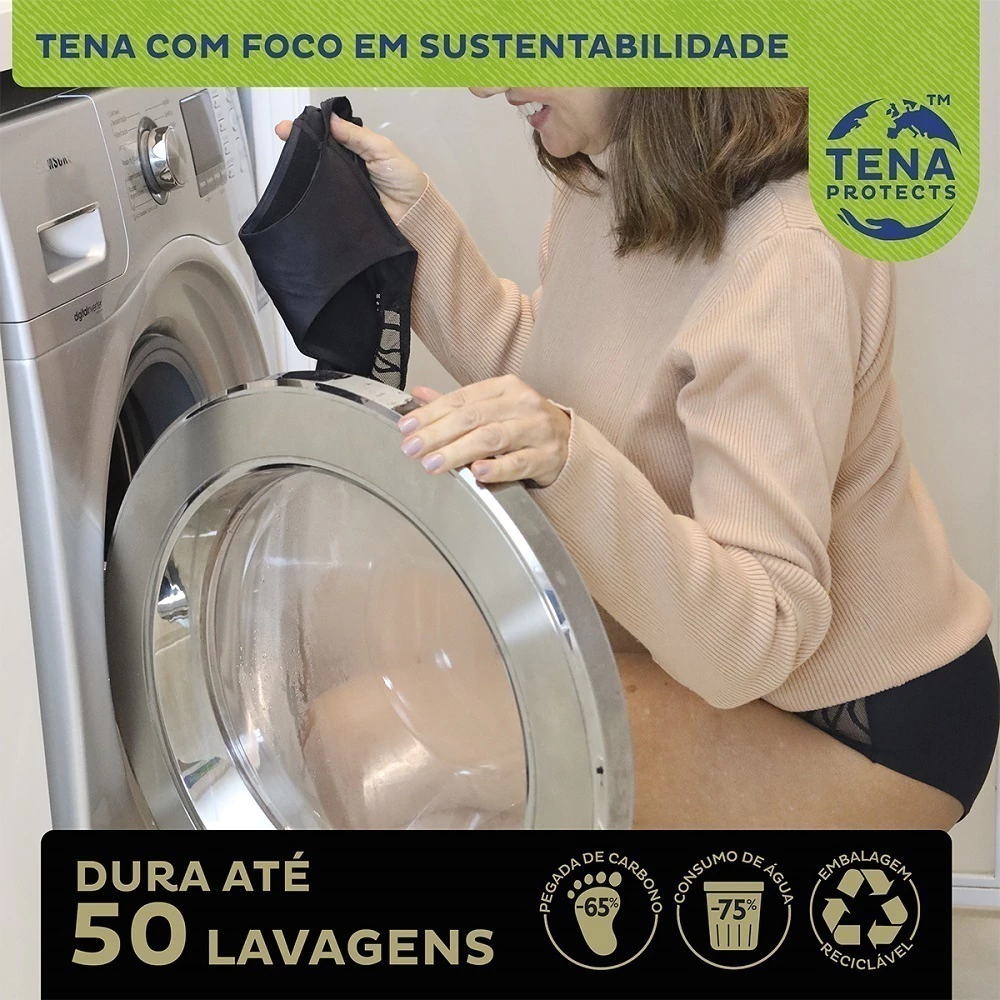 TENA Calcinha Lavável foi desenhada para mulheres com incontinência urinária leve que procuram mais conforto e discrição. É um produto feminino, tecnológico e sustentável.