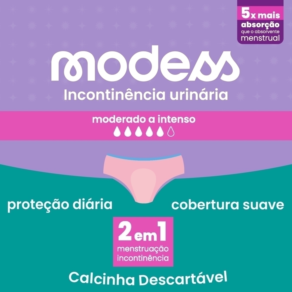 Indicado para incontinência urinária moderado a intenso. Tamanhos M/G - Quadril: 100 - 110 cmOs produtos são válidos por 2 (dois) anos após data de fabricação se mantidos fechados em locais secos.As Calcinhas descartáveis Modess Incontinência, foram desenvolvidas pensando no bem estar damulher, com a função 2 em 1, absorvendo e retendo a urina e menstruação, proporcionandoproteção contra vazamentos, apresenta a tecnologia respirável para evitar abafamentos durante ouso, tecnologia antibacteriano reduzindo o crescimento de microrganismo, tecnologia antiodorpermitindo a neutralização e controle do odor, com fios elásticos garantindo ajuste ao corpo,cobertura suave e macia proporcionando conforto durante o uso.