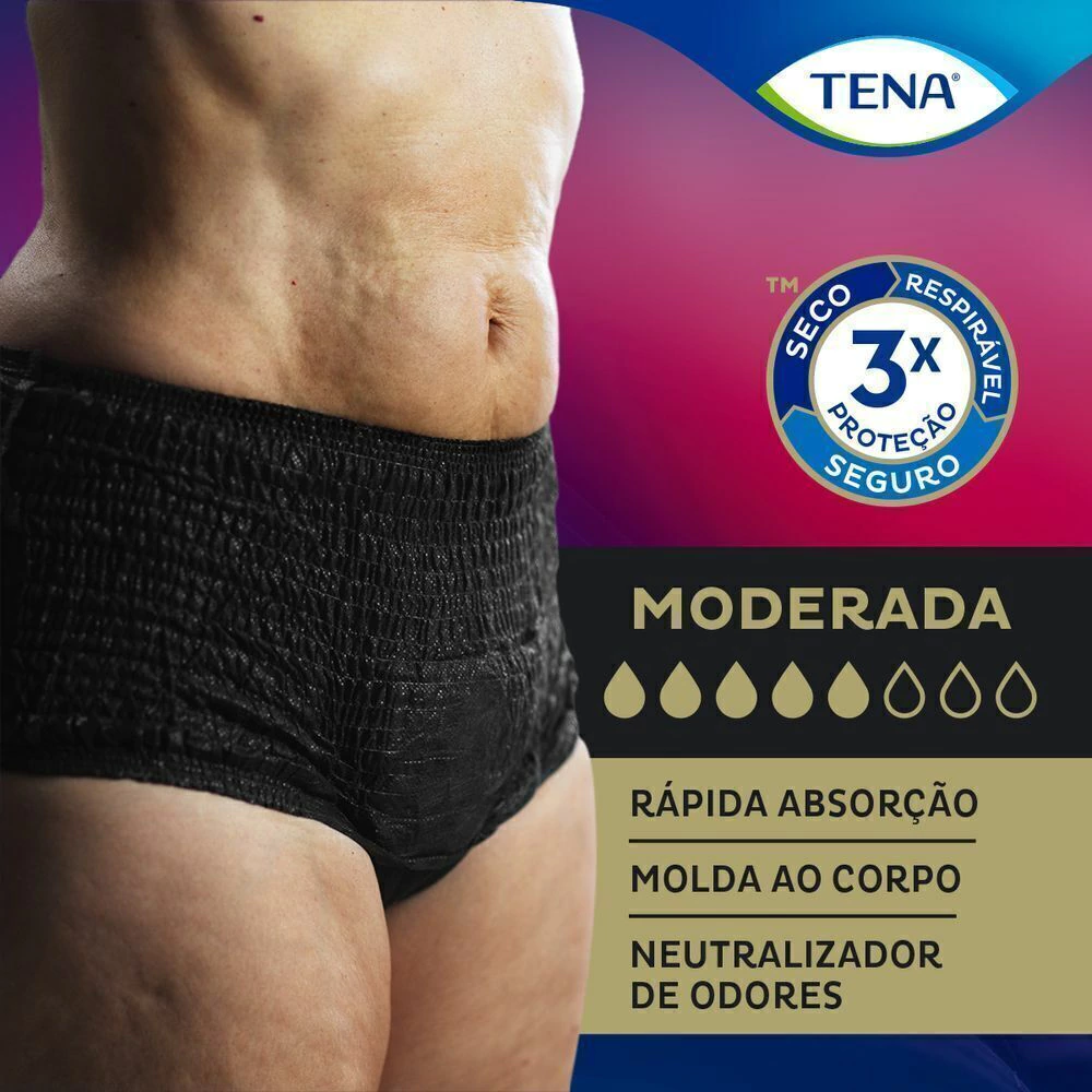 TENA Pants Discreet é uma excelente opção para mulheres ativas com incontinência urinária moderada, mais segura, feminina e discreta. Ela proporciona conforto, facilidade de uso.A calcinha absorvente TENA Pants Discreet é como uma calcinha que a mulher está acostumada a usar e se molda perfeitamente ao corpo. Também tem rápida absorção, neutralizador de odores, proporcionando maior segurança contra vazamento, e é muito feminina. Disponível nas cores nude e preta (exclusividade). A excepcional segurança deve-se à tecnologia que absorve rapidamente a urina mantendo-a longe da pele, mantendo-a seca, auxiliando a reduzir o risco de irritações ou infecções cutâneas. A calcinha descartável TENA discreet também pode ser usada como calcinha absorvente pós-parto, já que possui alta absorção, com maior segurança e conforto.