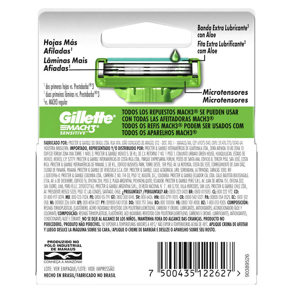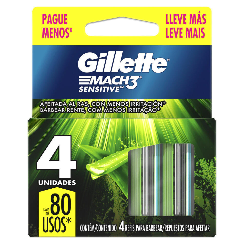 As cargas para aparelho de barbear Gillette Mach3 Sensitive, ideal para homens com pele sensível, proporcionam um barbear rente com menos irritação. Os refis do aparelho de barbear Mach3 Sensitive possui uma fita lubrificante com Aloe e Vitamina E e 3 lâminas mais fortes do que o aço que permanecem afiadas por mais tempo*. A carga Mach 3 Sensitive possui uma cabeça flexível que se ajusta aos contornos de seu rosto e 10 microtensores que suavizam a pele para protegê-la a cada passada. As lâminas de barbear Mach3 Sensitive proporcionam até 20 barbas feitas por refis. Os refis do barbeador Gillette Mach3 Sensitive são compatíveis com qualquer cabo da família Mach3. Complete sua rotina com a espuma de barbear e a loção pós-barba Gillette Sensitive. (*vs. Prestobarba3)