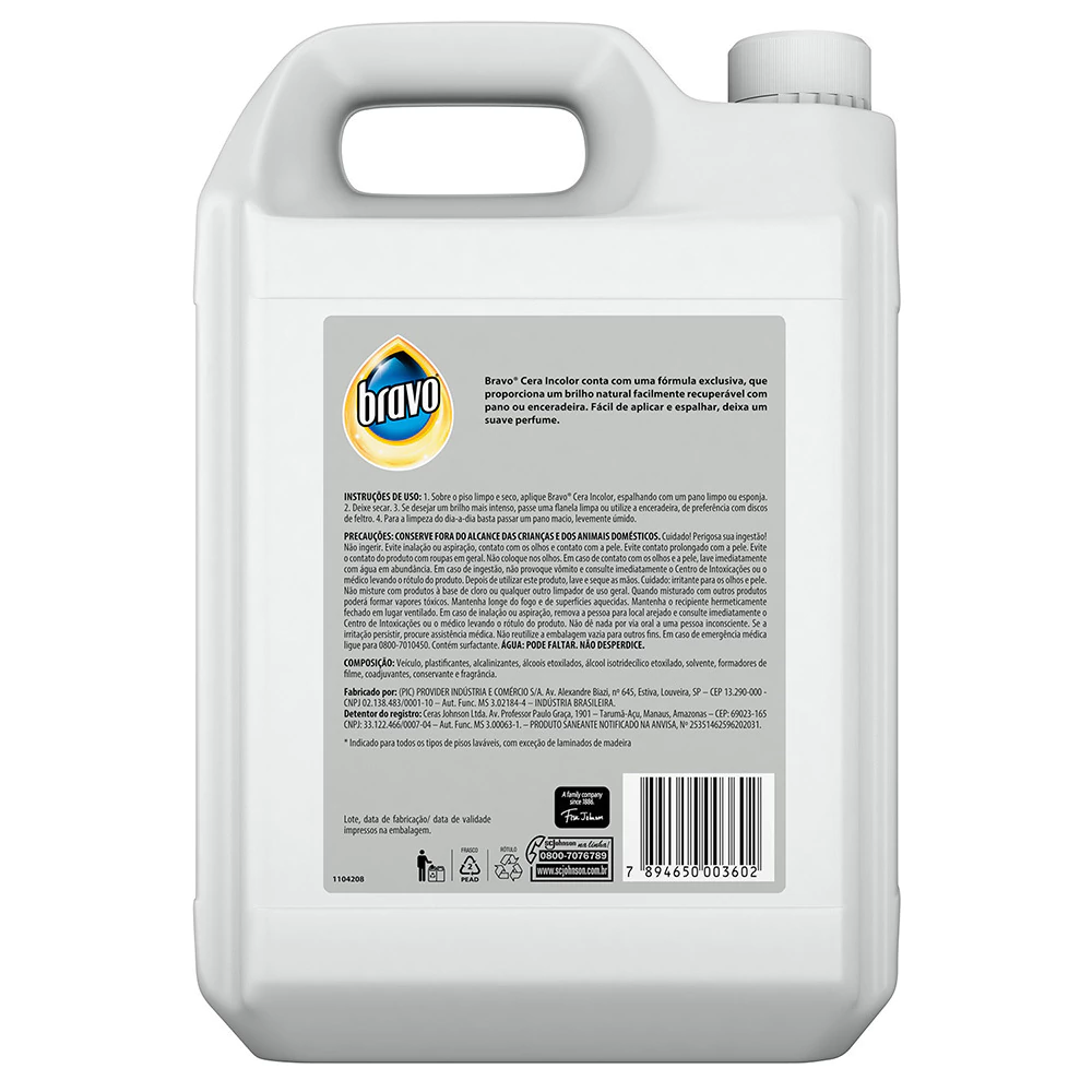 Cera Líquida Bravo Incolor Classic 5l Composição: Parafina, cera de carnaúba, emulsificante, alcalinizante, plastificante, coadjuvante, formol, perfume e água. Informação Adicional: Indicado para todos os tipos de pisos laváveis, com exceção de laminados de madeira.* Compre Produtos Bravo
