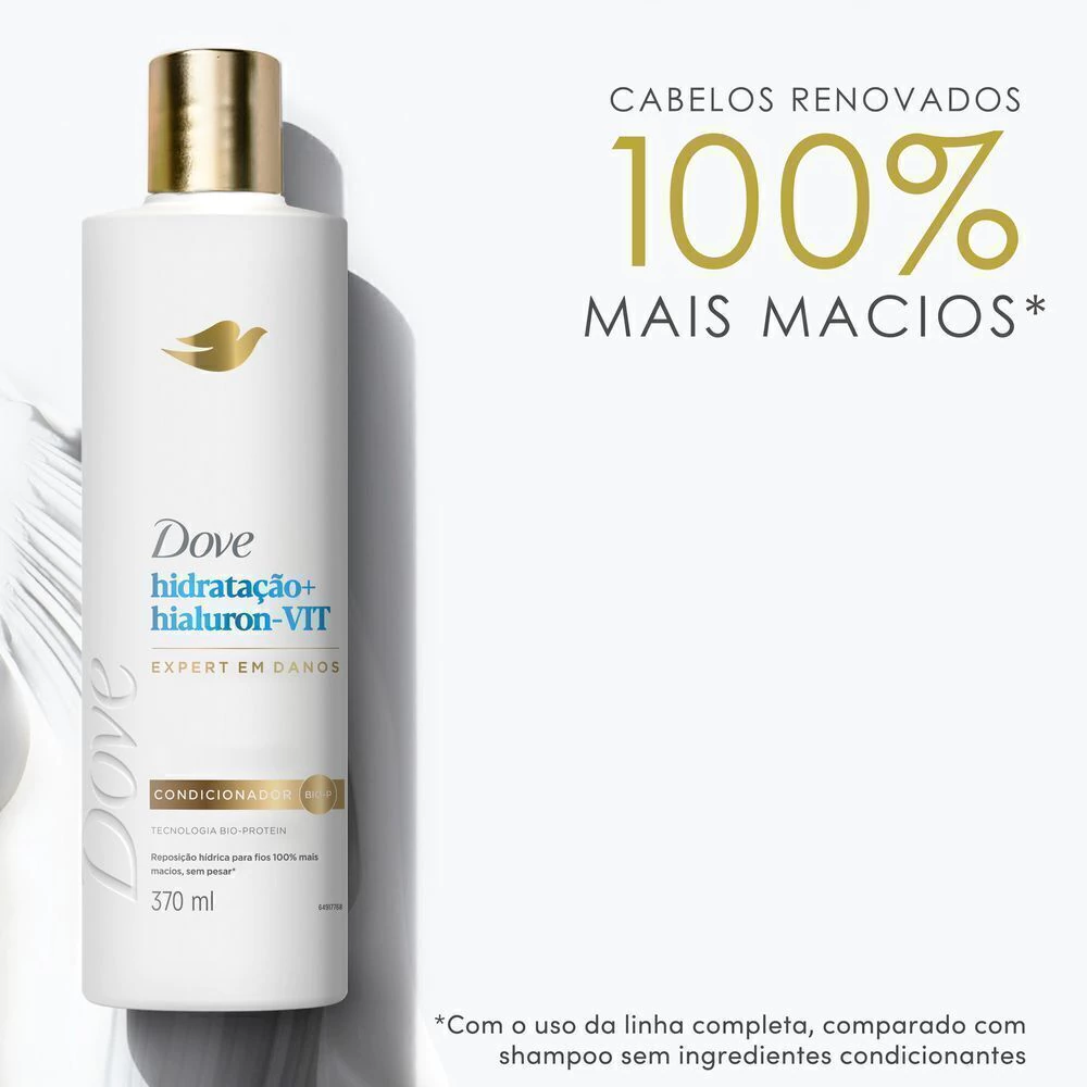 O Dove Condicionador Hidratação + Hialuron-Vit 190ml é o aliado perfeito para tratar cabelos ressecados e sem vida. Sua fórmula avançada combina o poder do ácido hialurônico com vitamina, promovendo uma hidratação profunda e duradoura que transforma os fios desde a primeira aplicação. Além de hidratar, o condicionador nutre profundamente, deixando os cabelos macios, leves e com movimento natural. Indicado para cabelos secos e ressecados, este condicionador é ideal para quem busca um cuidado eficaz e prático no dia a dia. Sua textura leve garante uma hidratação para fios 100% mais macios, sem pesar*. Ele é especialmente indicado para a etapa de hidratação no cronograma capilar, devolvendo a vitalidade e beleza natural aos cabelos. Com o Dove Condicionador Hidratação + Ácido Hialurônico e Vitamina, você terá cabelos mais saudáveis a cada lavagem. Dermatologicamente testado, ele é seguro para uso diário e pode ser utilizado em todos os tipos de cabelo. Para resultados ainda mais eficazes, utilize a linha completa Dove Hidratação + Ácido Hialurônico e Vitamina e potencialize os benefícios do seu tratamento capilar. *Com o uso do shampoo e condicionador da linha em comparação com shampoo sem agentes condicionantes.