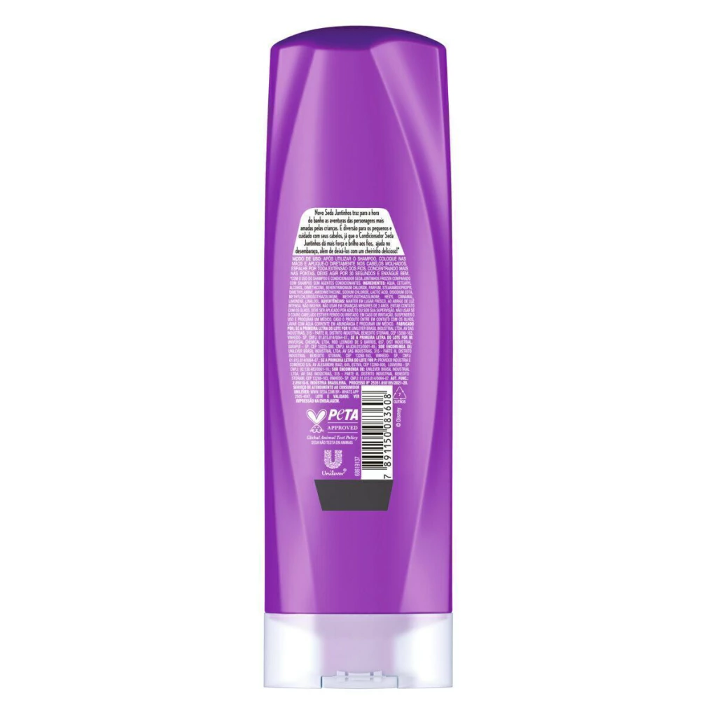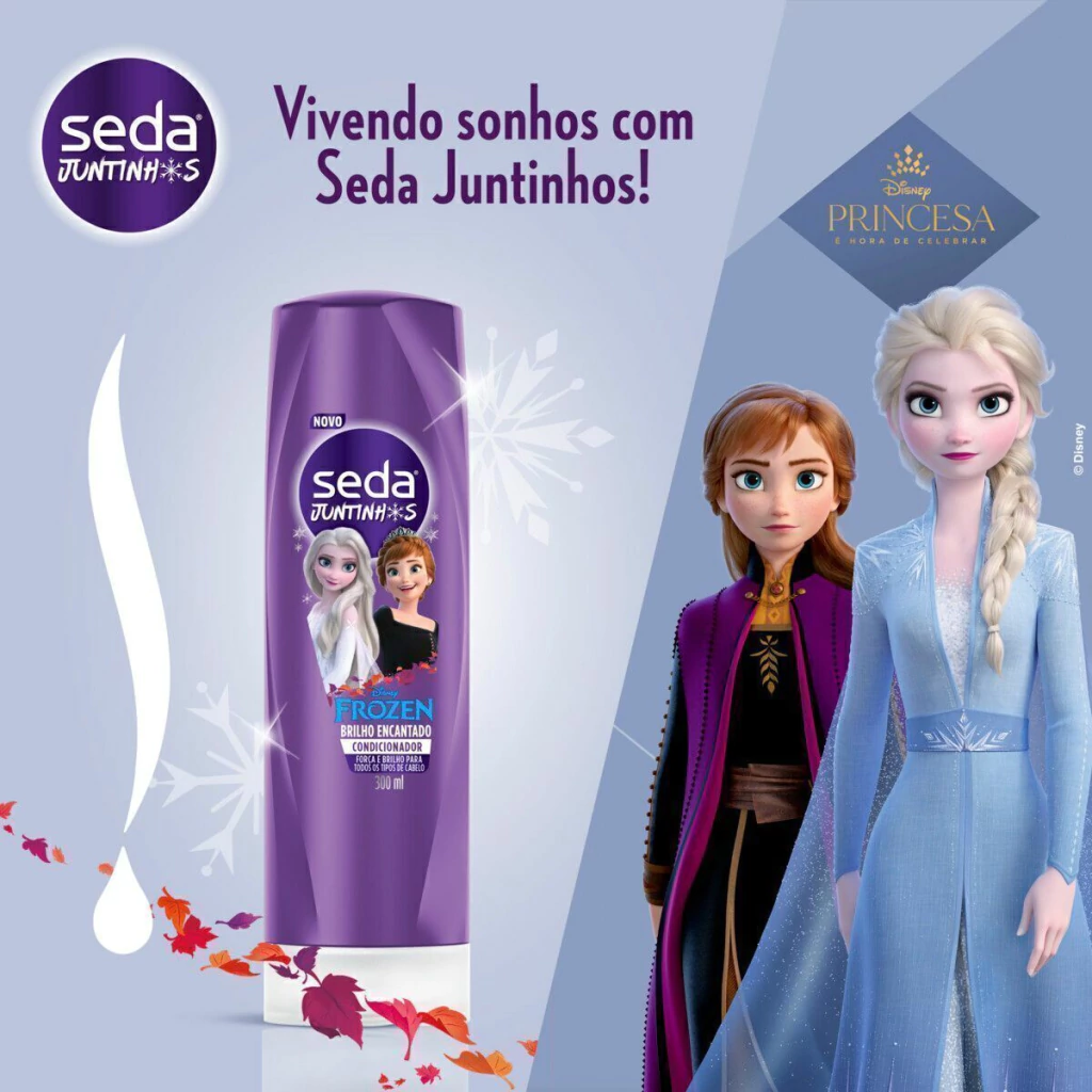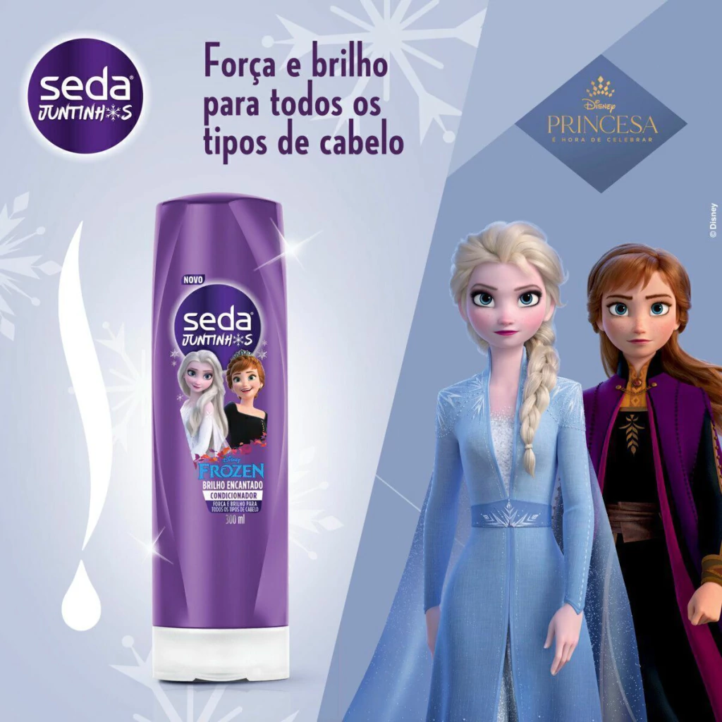 o Condicionador Frozen Brilho Encantado. o Força e briho para todos os tipos de cabelo. o O Condicionador Seda Juntinhos limpa e dá mais força e brilho aos fios, deixando-os mais fáceis de pentear e com um cheirinho delicioso! o Seda não testa em animais. o Com o uso do shampoo e condicionador Seda Juntinhos Frozen em comparação com shampoo sem agentes condicionantes ** inclusão de pelo menos 39% de plástico reciclado. o Nossa garrafa é feita com plástico reciclado ** e é 100% reciclável