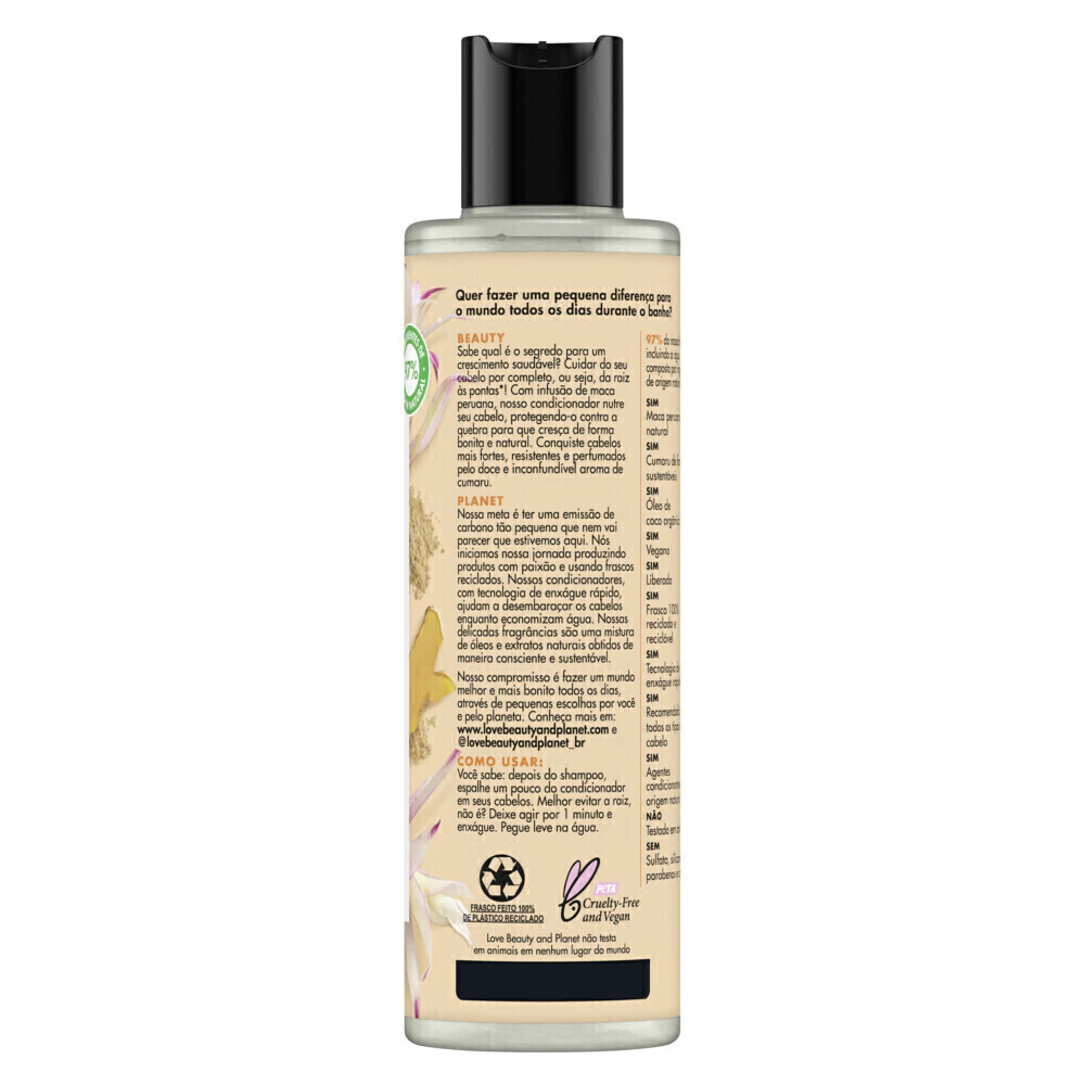o Cabelos fortes e crescimento saudável, da raiz às pontas. o Com infusão de maca peruana nutre o cabelo, protegendo contra a quebra, para que cresça de forma bonita e natural. o Conquiste cabelos mais fortes, resistentes e perfumados pelo doce e inconfundível aroma de cumaru. o Com 97% da nossa fórmula, incluindo a água, composta por ingredientes de origem natural, vegana, e não testada em animais. Love Beauty and Planet não testa em animais em nenhum lugar do mundo. o Livre de Parabenos, Silicones e Corantes. o Recomendado para todos os tipos de cabelo.