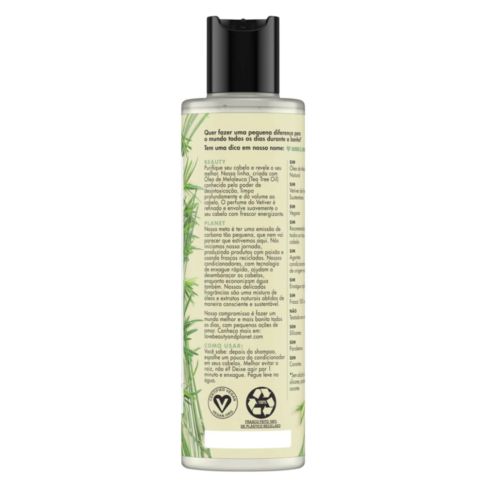 - A linha Energising Detox de Love Beauty and Planet, criada com óleo de melaleuca & vetiver, possui o tratamento que você precisa para purificar e trazer o melhor do seu cabelo. - Envolva-se com todo o frescor energizante do vetiver, cultivado de forma consciente e sustentável no Haiti. - Esse suave condionador com o óleo de melaleuca, ajuda na purificação do seu cabelo, enquanto dá volume. - A fórmula de Energising Detox é vegana e não testada em animais. Além disso, é livre de Parabenos, Silicones e Corantes. - Nossos frascos não são tão transparentes, pois são feitos de plástico 100% reciclado. Eles também são recicláveis, assim causamos menos impacto no meio ambiente. - Nós acreditamos que você não precisa abrir mão de ficar bonita para cuidar do planeta. Por isso, Love Beauty & Planet incentiva suas consumidoras a fazerem pequena ações de amor pelo planeta!
