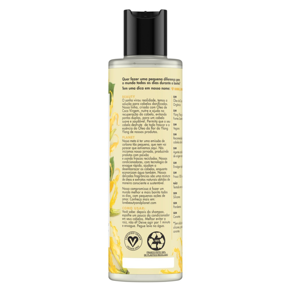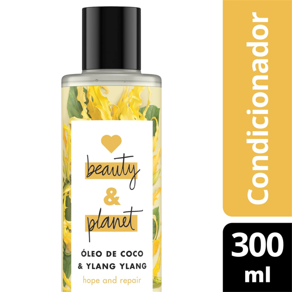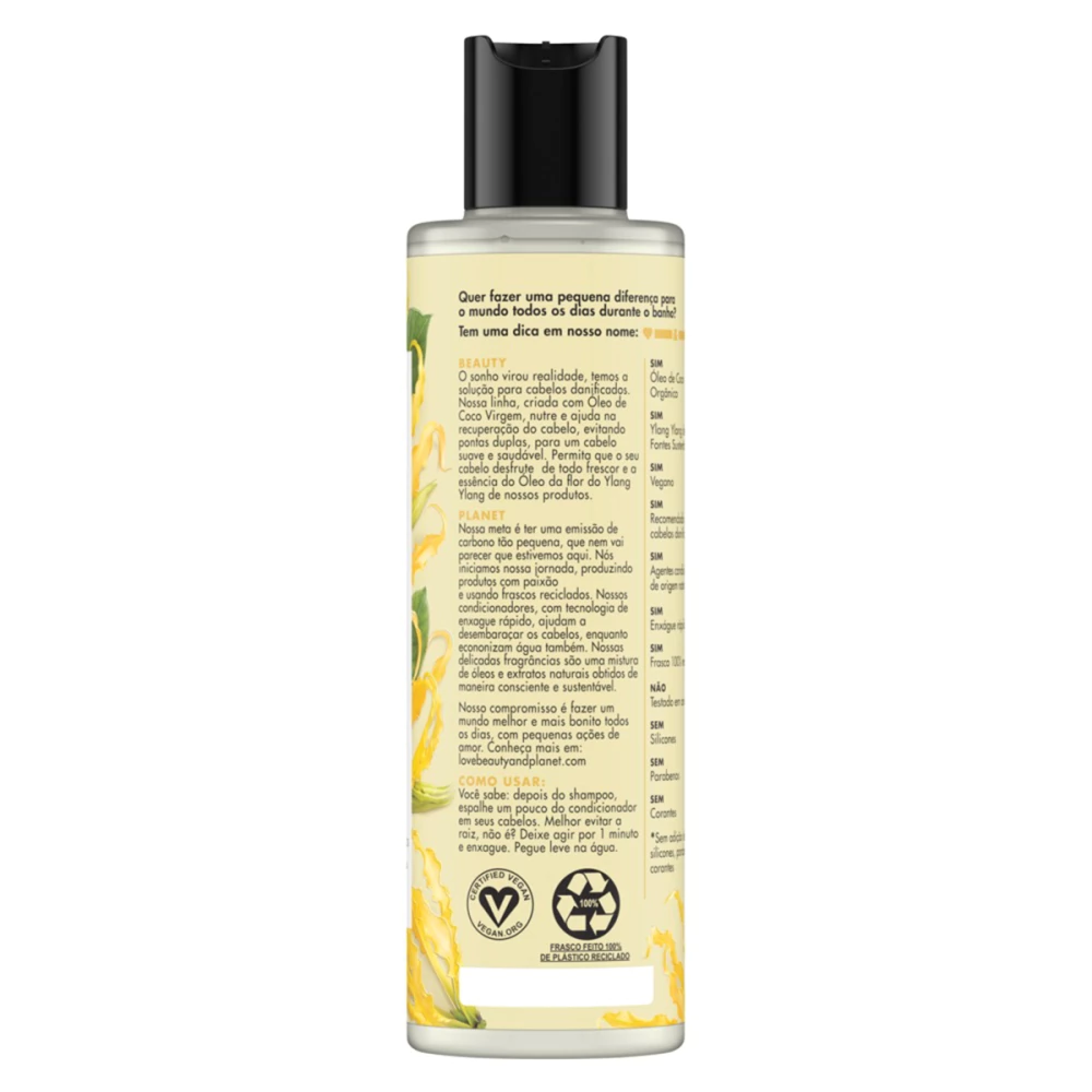 - A linha Hope & Repair de Love Beauty and Planet, criada com óleo de coco orgânico e ylang ylang, possui o tratamento completo para a reparação do cabelo danificado. - Desfrute do exótico frescor do óleo da flor de Ylang Ylang cultivada de forma consciente e sustentável na ilha de Comores. - Esse incrível condicionador com óleo de coco orgânico nutre e ajuda na recuperação do seu cabelo. Isso quer dizer: menos pontas duplas, mais maciez, mais brilho e cabelo mais saudável. - A fórmula de Hope & Repair é vegana e não testada em animais. Além disso, é livre de Parabenos, Silicones e Corantes. - Nossos frascos não são tão transparentes, pois são feitos de plástico 100% reciclado. Eles também são recicláveis, assim causamos menos impacto no meio ambiente. - Nós acreditamos que você não precisa abrir mão de ficar bonita para cuidar do planeta. Por isso, Love Beauty & Planet incentiva suas consumidoras a fazerem pequena ações de amor pelo planeta!
