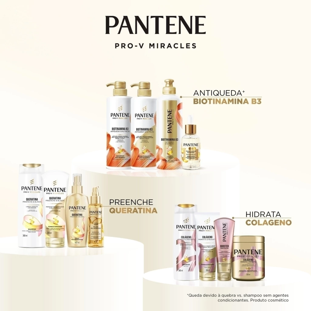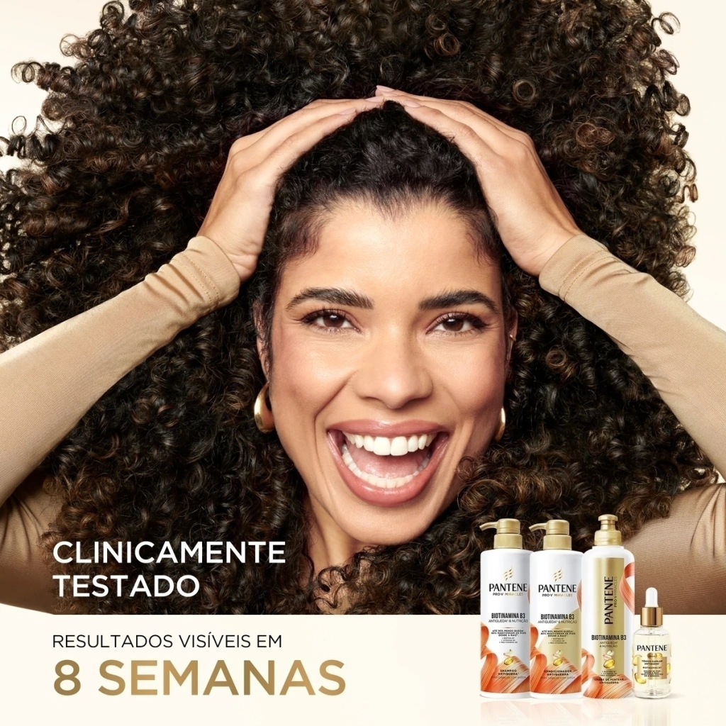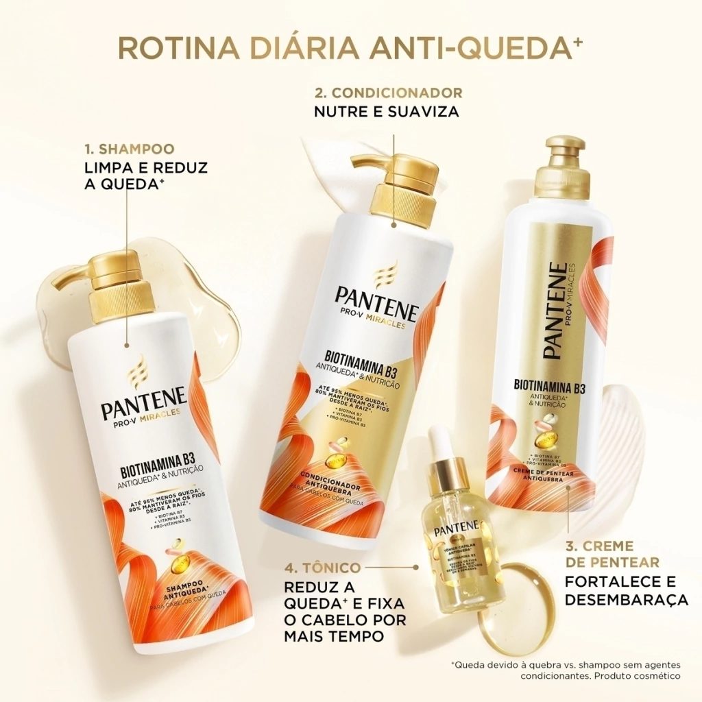 o Reduz até 95% da queda* *Queda devido à quebra vs. shampoo sem agentes condicionantes o Segura os fios desde a raiz° °Com base em um estudo clínico onde 80% dos participantes mantiveram o mesmo número de cabelos em 8 semanas. Resultados usando o regime Pantene Biotinamina B3 incluindo o tônico o Cabelo visivelmente saudável de dentro para fora o Mix de vitaminas capilares: + BIOTINA B7 + VITAMINA B3 + PRO-VITAMINA B5 o Fortalece e proporciona maciez ao cabelo o Nutrição e hidratação profunda, reduzindo a quebra