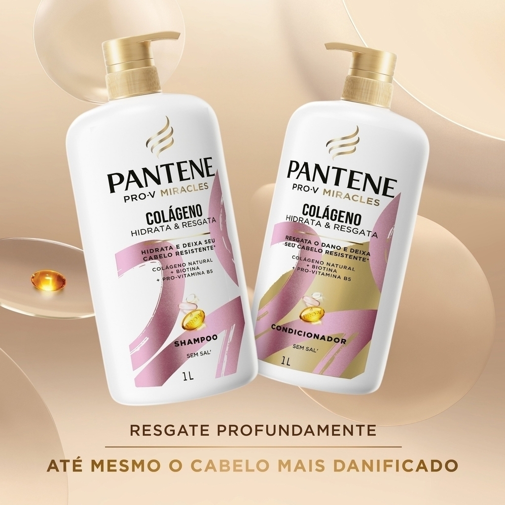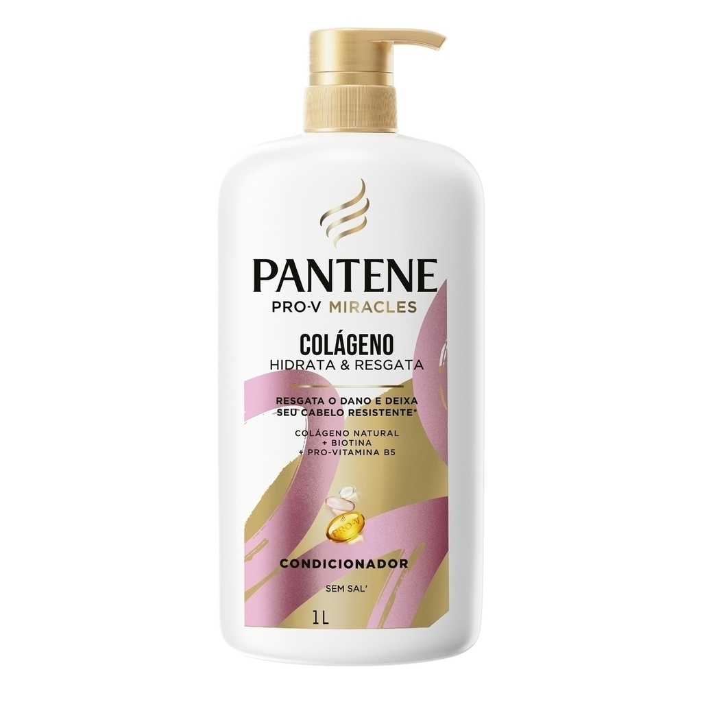 O condicionador sem sal' Pantene Pro-v Miracles Colágeno Hidrata & Resgata, resgata profundamente o cabelo, reduz as pontas duplas, fecha as cutículas e hidrata e revitaliza. Com colágeno natural, biotina, Pró-vitaminas B5, repara e revitaliza os cabelos deixando-os brilhantes e saudáveis. Inspirados nos benefícios mais renomados do mundo junto ao poder da Pro-Vitamina B5, os produtos Pantene Pro-V Miracles Colágeno Hidrata & Resgata te ajudarão com a nutrição capilar da raiz até as pontas, graças a uma poderosa fórmula com Colágeno 100% natural; Pró-vitamina B5 e Biotina que protege o cabelo dos danos associados às constantes transformações.
