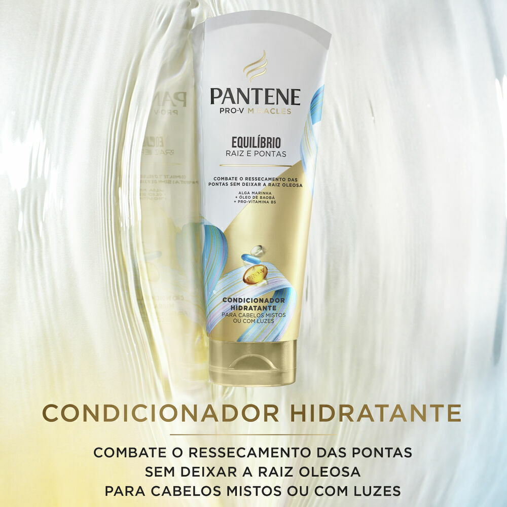 Você sente que tem dois cabelos em um? Já tentou de tudo para deixar as pontas dos cabelos com a mesma hidratação da raiz sem deixá-la pesada e oleosa? Então o Condicionador Hidratante Pantene da coleção Equilibrio Raiz e Pontas com óleo de baobá e algas marinhas é ideal para você. Seu complexo Pro-V Miracle penetra profundamente nos fios equilibrando os cabelos mistos, hidratando profundamente as pontas ressecadas ou espigadas e proporcionando o aspecto saudável que você tanto merece. Além disso, sua fórmula com ingredientes hidratantes e purificantes é segura para cabelos com luzes, deixando-os mais soltinhos, frescos e brilhosos. Mergulhe nas sensações de exuberância, pureza e leveza de coração com a fragrância repleta de notas alegres de laranja, toranja, groselha e notas florais com uma pitada de água de coco que vão transportar você para uma experiencia inesquecível. A coleção Pantene Equilíbrio Raiz e Pontas elimina a oleosidade da raiz e hidrata as pontas.