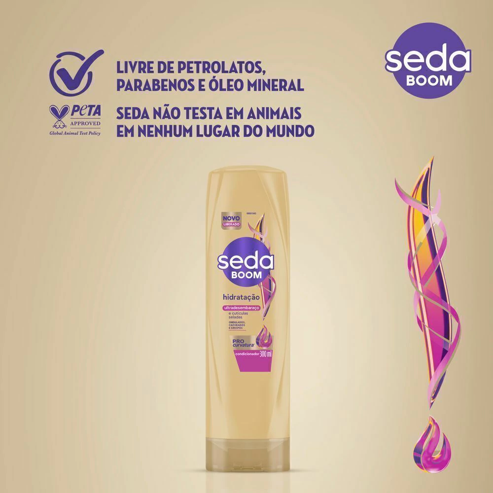 A vida é cheia de possibilidades - tenha um cabelo incrível para todas elas. Está pronta para conhecer a Nova Geração Seda Boom? O Condicionador Seda Boom Hidratação Ultradesembaraço possui a tecnologia ProCurvatura, que mantém os fios juntos e alinhados, ativando e memorizando a sua curvatura por até 72h. Esse Condicionador é liberado, livre de petrolatos, parabenos e óleo mineral em sua composição. Sua fórmula hidratante contém Colágeno + Óleo de Macadâmia, conhecidos por estimular o crescimento, prevenir a queda dos fios e proteger naturalmente os cabelos. Esse condicionador hidrata profundamente o seu cabelo e sela suas cutículas, para ultra desembaraçar e ativar seu brilho, como ele merece! O Condicionador Seda Boom Hidratação Ultradesembaraço é indicado para cabelos crespos, cacheados e ondulados, podendo ser usado diariamente. Pronta? Após lavar com Shampoo Seda Boom Hidratação, coloque na mão, aplique nos cabelos molhados. Espalhe por todo o cabelo, concentrando no comprimento e pontas. Deixe agir por 30 segundos e enxágue bem. Para resultados mais incríveis, use toda a linha Seda Boom: Shampoo, Máscara de Tratamento, e os Cremes para Pentear. Seda possui a certificação Cruelty-Free da PETA, o que significa que Seda não testa seus produtos em animais. #JuntasArrasamos com fios mais lindos e hidratados.