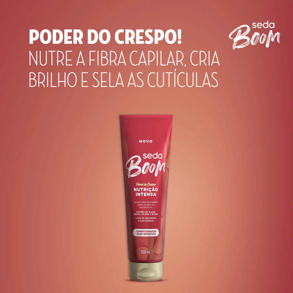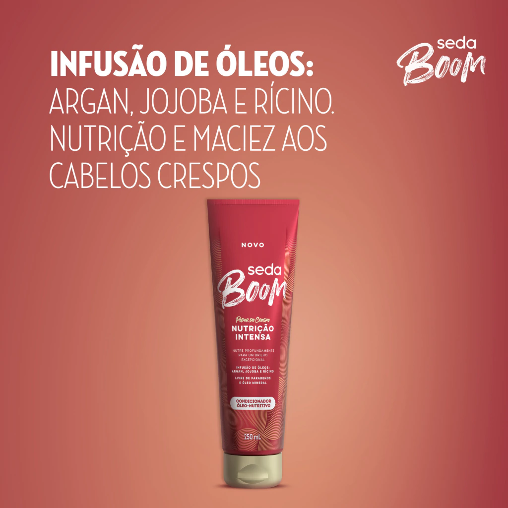 oO Condicionador Seda Boom Nutrição Intensa é o novo condicionador óleo-nutritivo que nutre profundamente para um brilho excepcional oA fórmula desse condicionador é enriquecida com uma infusão de óleos: argan, jojoba e rícino, que promove nutrição e maciez aos cabelos crespos oCondicionador óleo-nutritivo que nutre intensamente a fibra capilar, criando um brilho excepcional nos fios oEste condicionador Seda Boom possui uma textura creme acetinada que sela as cutículas dos cabelos crespos, deixando-os muito macios oEsse condicionador é ideal para cabelos crespos e é livre de parabenos e óleo mineral oO Condicionador Seda Boom Nutrição Intensa deixa seu cabelo crespo incrivelmente macio