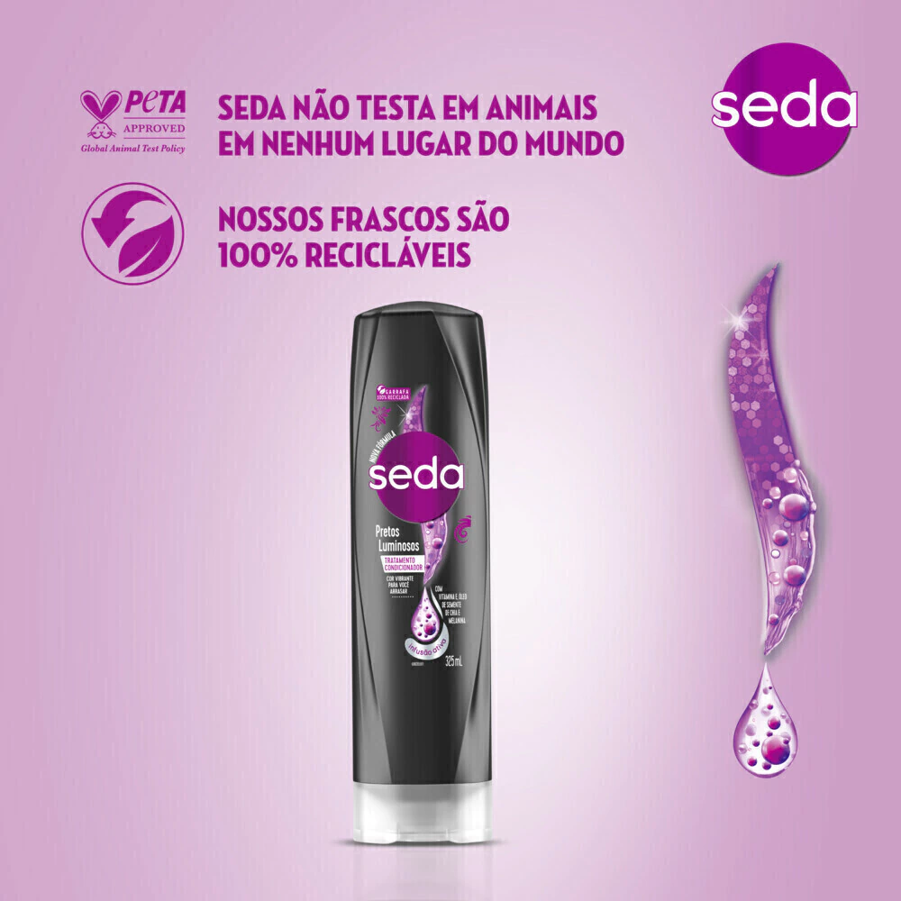 o Condicionador Seda com fórmula exclusiva, com melanina, reaviva os fios pretos do seu cabelo. o Tratamento condicionador com secagem rápida, para menos tempo secando e menos tempo danificando*.*COMPARADO COM SHAMPOO SEDA PRETOS LUMINOSOS. o Hidratação capilar para pretos lindos e luminosos! o Brilho e hidratação para o cabelo. o Indicado para cabelos pretos que querem mais brilho, maciez e hidratação. o Condicionador hidratante Seda pode ser usado diariamente.