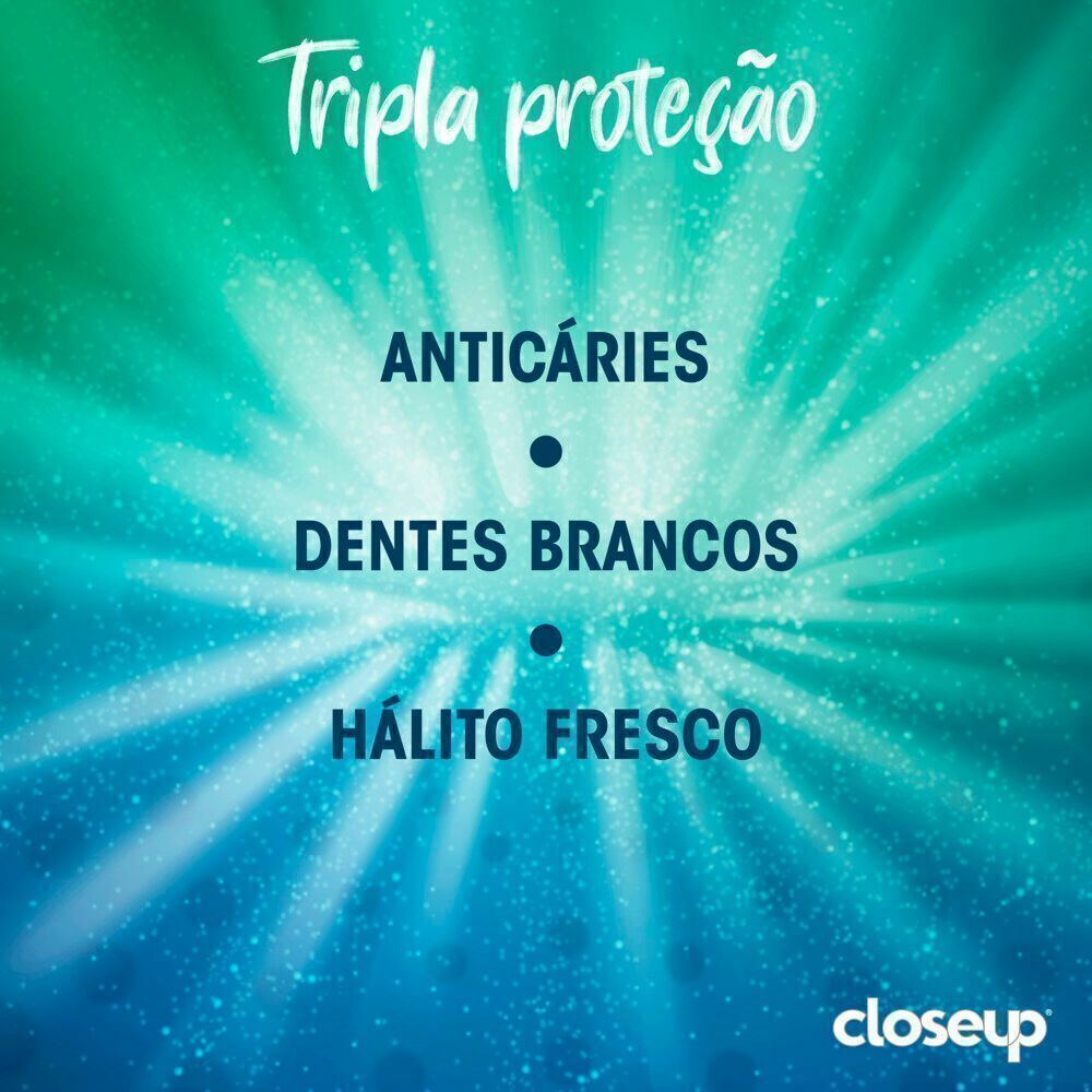 O flúor bioativo ajuda no combate às cáries, enquanto o cálcio auxilia no fortalecimento dos dentes. Além disso, a pasta de dente Closeup Triple ajuda na remoção de manchas da superfície dos dentes, deixando-os mais brancos a cada escovação.