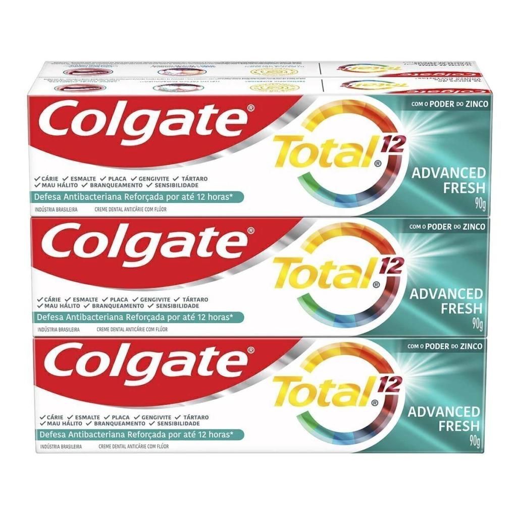 Total 12 Advanced Fresh: aproveite uma saúde bucal completa para você e sua família com a pasta de dentes Colgate Total 12 Advanced Fresh com o poder do Zinco, que deixa um hálito fresco duradouro (com escovação regular). Total 12 Whitening: a pasta de dentes com Zinco Colgate Total 12 Whitening é ideal para uma saúde bucal completa, fornecendo até 12 horas de defesa ativa contra bactérias (até 12 horas de proteção contra bactérias e mau hálito, com uso contínuo por 4 semanas), enquanto ajuda a remover manchas dos dentes.