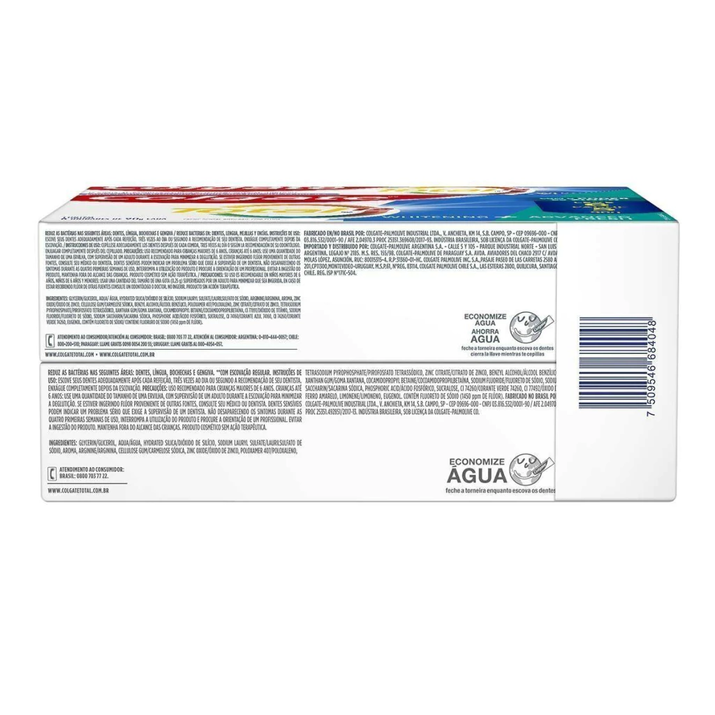Benefícios: O creme dental Colgate Total 12 proporciona até 12 horas de defesa ativa contra bactérias* para que sua boca permaneça protegida por mais tempo. Sua tecnologia superior fortalece sua higiene bucal mesmo após a escovação. Com o poder do Zinco, protege sua boca de bactérias para uma boa saúde dental.Reduz a formação de bactérias nos dentes, língua, bochechas e gengiva. Assim, você pode ter um sorriso e boca saudáveis por mais tempo. O uso da pasta de dentes Colgate em sua rotina de limpeza apoia as defesas naturais de sua boca.