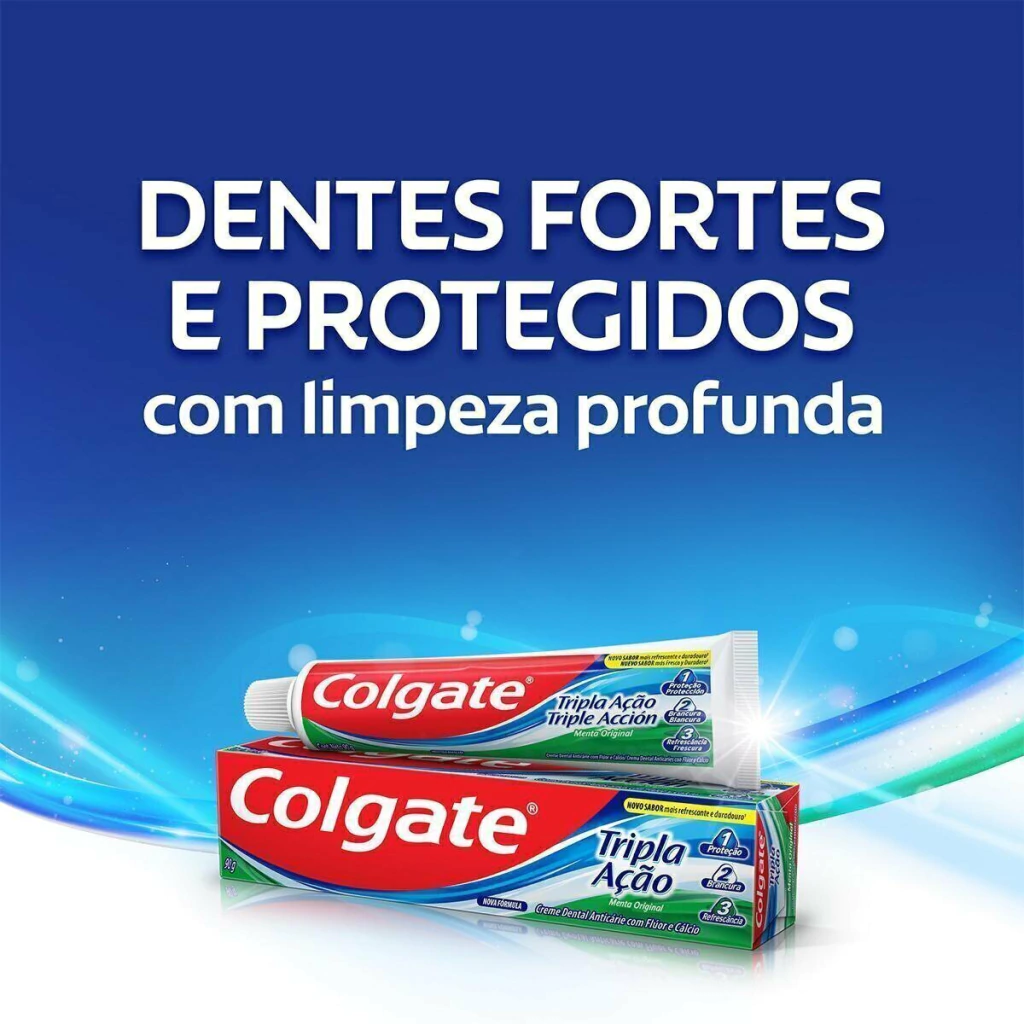 A pasta de dente Colgate Tripla Ação Menta Original proporciona tripla proteção para você e sua família: dentes brancos, protegidos e um hálito refrescante.