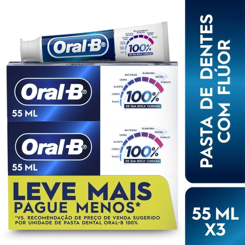o 100% DA SUA BOCA* CUIDADA contra os problemas bucais mais comuns. *áreas dos dentes, bochechas, gengivas e língua com a Pasta Dental 100% Oral-B, proporcionando uma limpeza profunda e eficaz. o O SABOR A MENTA da Pasta Dental 100% Oral-B proporciona um hálito refrescante enquanto ajuda a manter os dentes fortes e as gengivas saudáveis com sua tecnologia de proteção múltipla. o PROTEGE sua boca contra placa bacteriana, mau hálito, tártaro e cáries com a Pasta Dental 100% Oral-B, que cuida de 100% da sua boca* contra os problemas bucais mais comuns. *áreas dos dentes, bochechas, gengivas e língua. o COMBATE os problemas bucais mais comuns com a Pasta Dental 100% Oral-B, cuidando de 100% da sua boca* contra os problemas bucais mais comuns. *áreas dos dentes, bochechas, gengivas e língua. o FÓRMULA que realça seu poderoso ingrediente para obter um branco radiante. Contém flúor que cuida e protege o esmalte dental e mantém até 100% da sua boca* cuidada contra os problemas bucais mais comuns. *áreas dos dentes, bochechas, gengivas e língua.