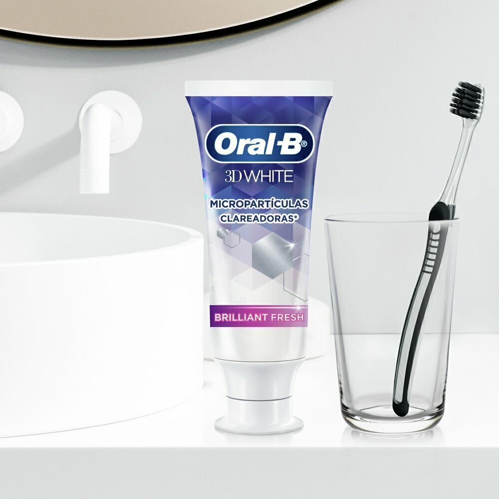 "Oral-B 3DW Brilliant Fresh elimina até 80% das manchas superficiais e é clinicamente comprovado. Essa pasta oferece uma das mais avançadas tecnologias de clareamento Oral-B. Tem flúor para cuidar e proteger o esmalte dos dentes e prevenir problemas como cáries e outras doenças bucais. Recomendamos escovar os dentes pelo menos três vezes ao dia e complementar sua rotina com os produtos Oral-B.