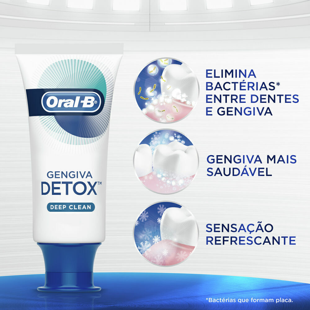 O novo creme dental Oral-B Gengiva Detox limpa profundamente entre dentes e gengiva. Milhões de bactérias se acumulam em um espaço onde cremes regulares não atuam, nos espaços entre dentes e gengiva. Oral-B traz para você a nova Gengiva Detox, com microespuma que limpa profundamente, prevenindo problemas de gengiva. * Elimina bactérias em lugares de difícil alcance.* Gengiva mais saudável, clinicamente comprovado.* Sensação refrescante depois da escovação.* Para uso diário.* Bactérias que formam placa.*Imagens Meramente Ilsutrativas.