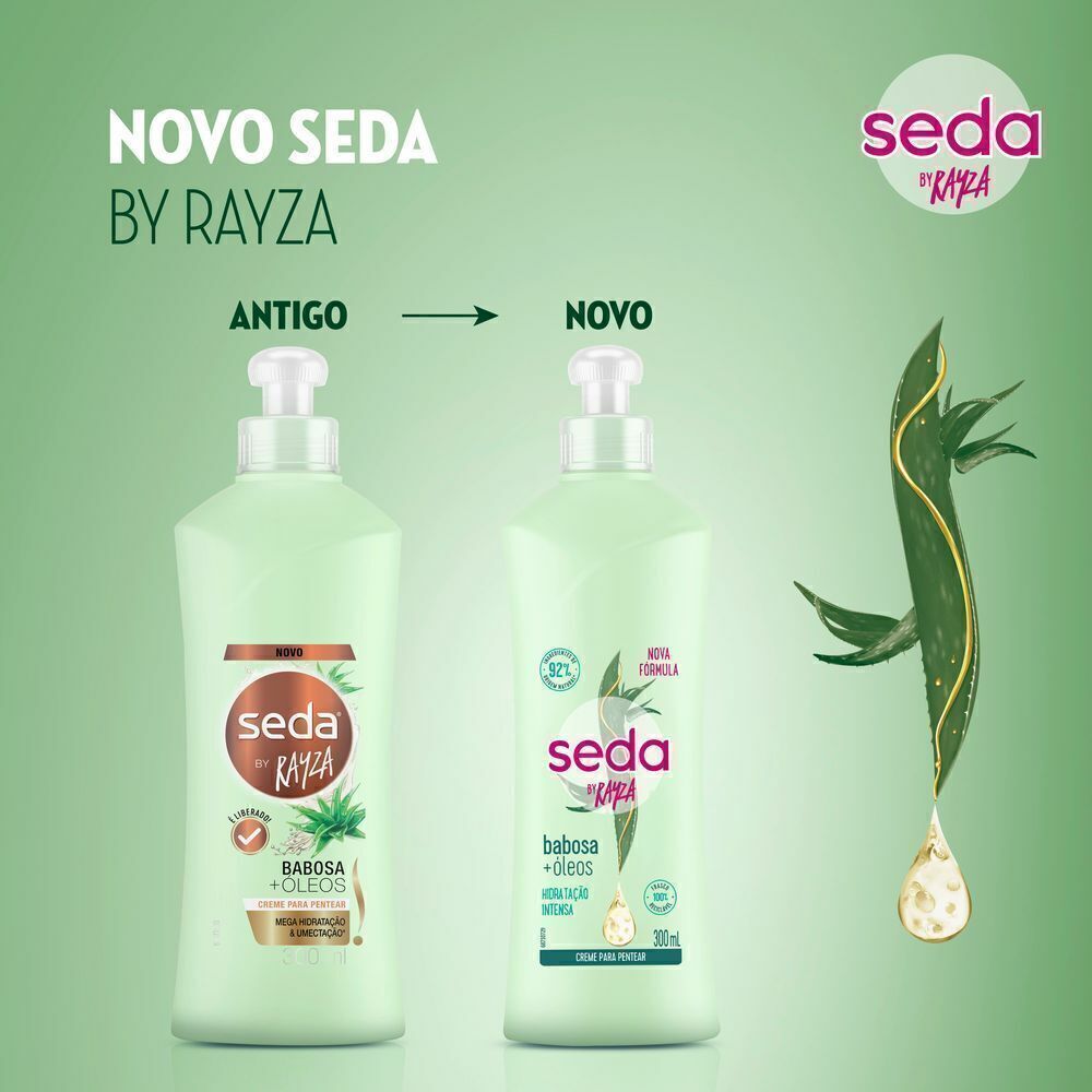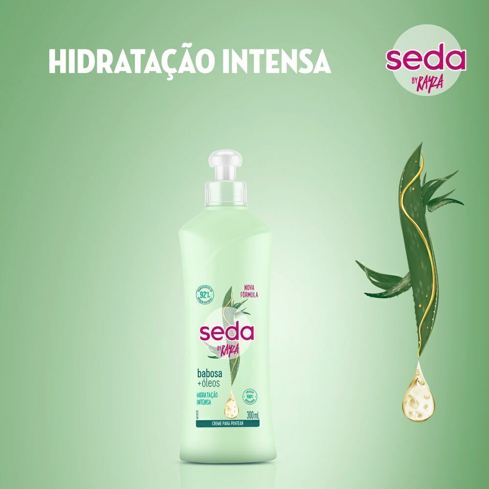 o O Creme para Pentear Seda By Rayza Babosa + Óleos possui uma nova fórmula com ingredientes orgânicos e Mix de Óleos Vegetais (Coco, Amêndoas e Argan), que fornece hidratação intensa aos seus cabelos o O creme para pentear possui uma fórmula exclusiva com babosa e óleos, conhecidos pelas propriedades hidratantes, emolientes e fortificantes, garantindo uma ótima finalização o Com um alto nível de vitaminas e nutrientes, o creme para pentear hidrata e penetra profundamente, indicado para cabelos que precisam de hidratação e umectação pura** o A fórmula exclusiva deste creme para pentear de hidratação intensa contém um mínimo de 92% de ingredientes de origem natural* o Este creme para pentear é ideal para cabelos secos e danificados por secador, além de ser sem parabeno e corantes o Seda se preocupa com o meio ambiente e não testa em animais em nenhum lugar do mundo. A garrafa deste creme para pentear é 100% reciclável