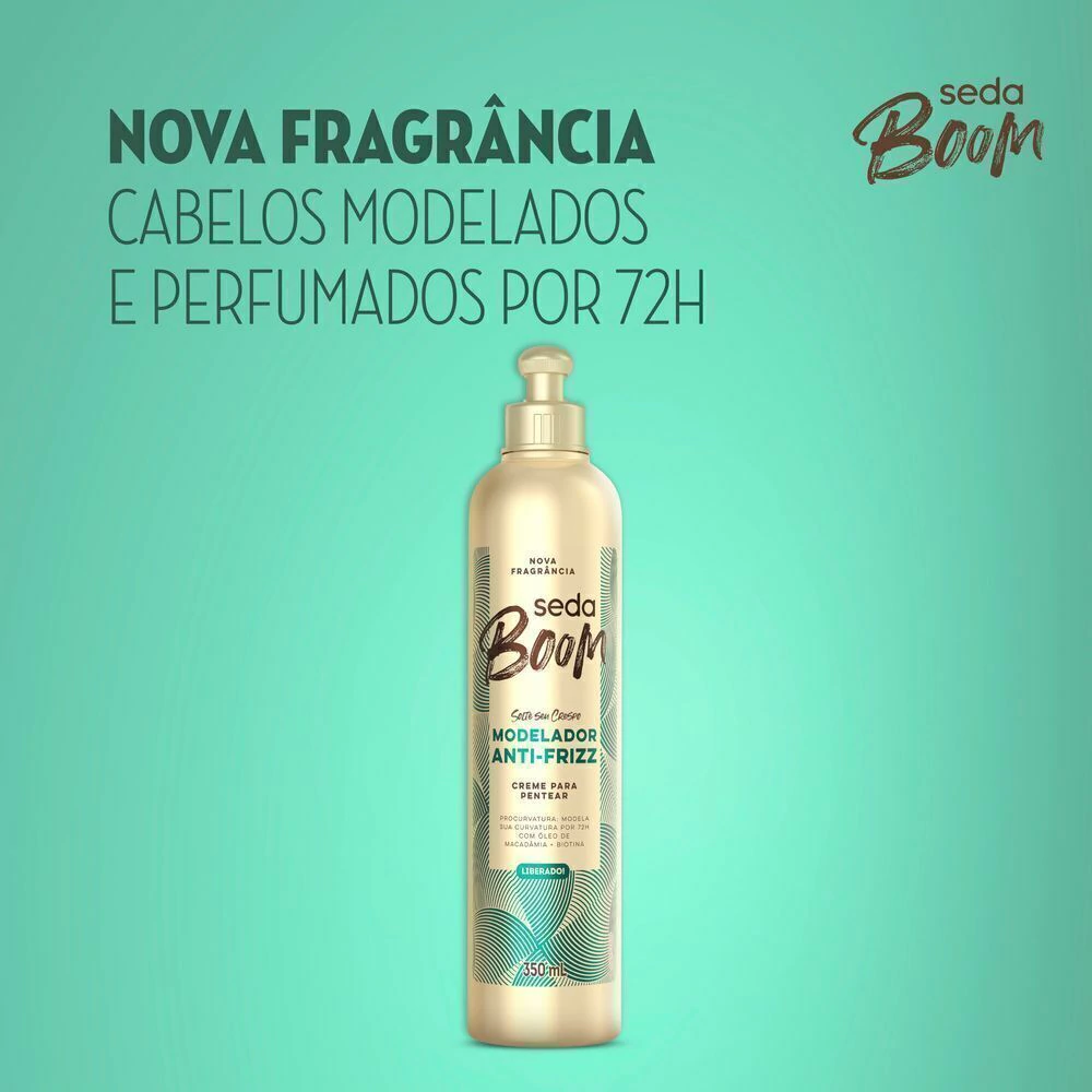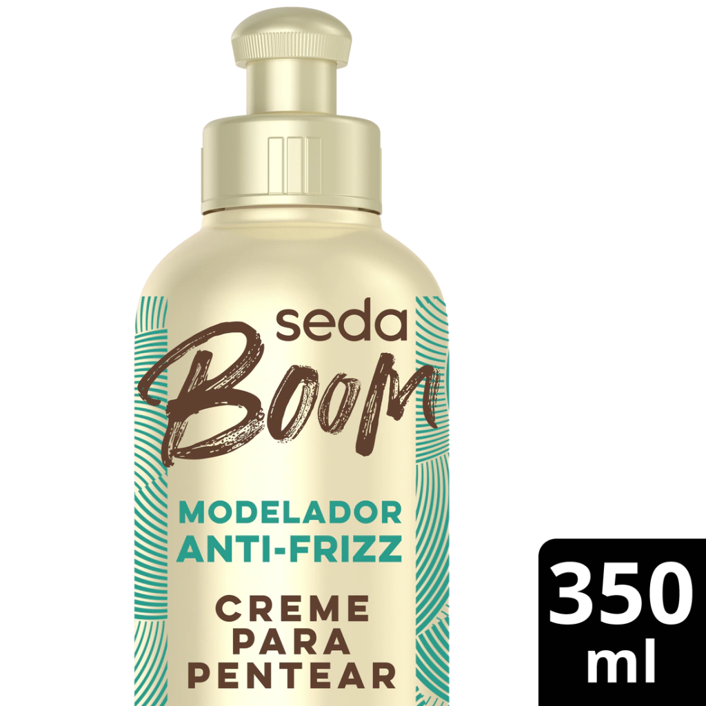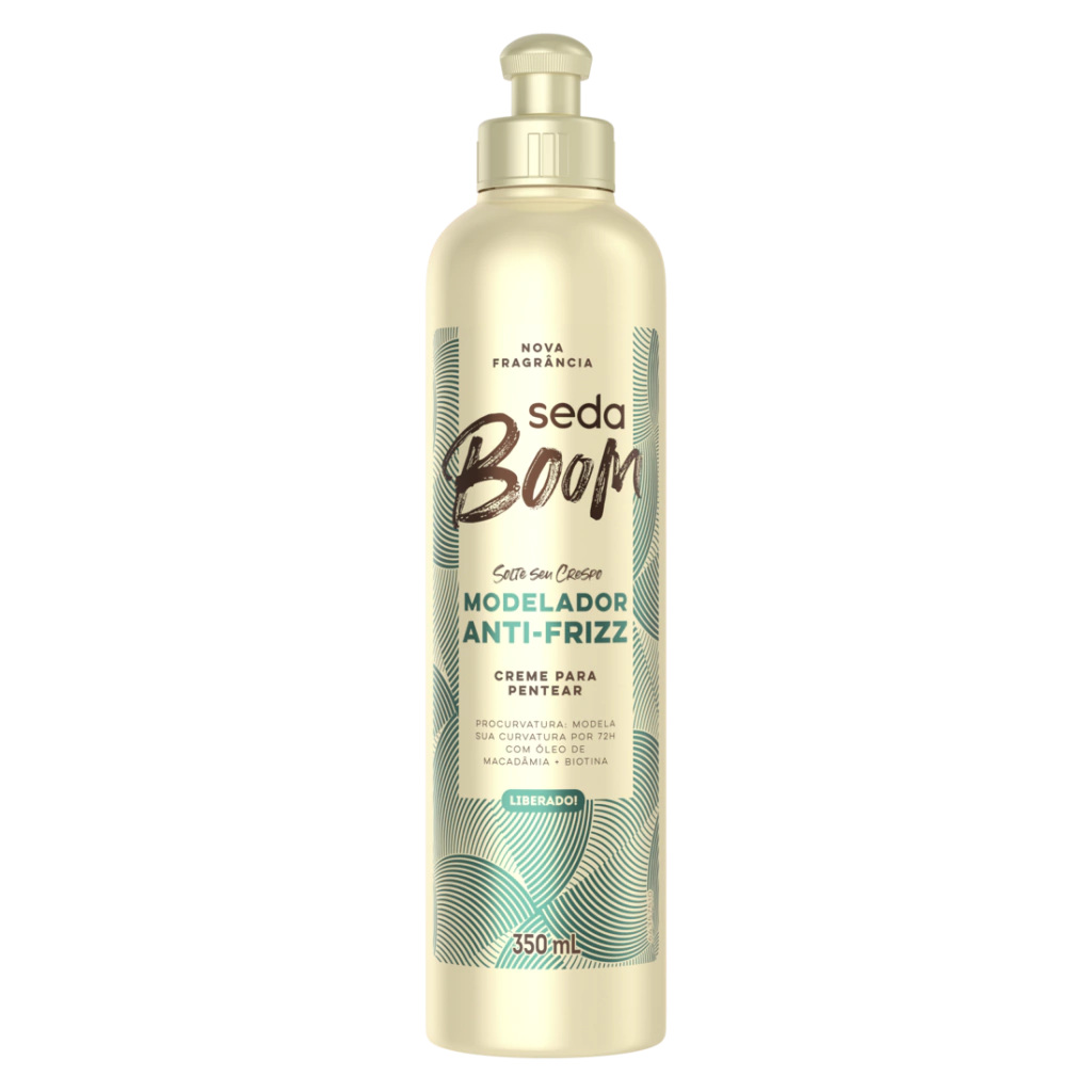 Seda Boom agora em nova fragrância para você soltar seus cachos! O Creme para Pentear Seda Boom Modelador Antifrizz possui tecnologia ProCurvatura, que mantém os fios juntos e alinhados, ativando e memorizando a sua modelação por 72h*. Este creme é enriquecido com óleo de macadâmia, que nutre e dá brilho, e biotina, que ajuda no crescimento de fios mais fortes e resistentes. Esta fórmula vai deixar seus fios nutridos profundamente e o frizz reduzido como ele merece! Esse creme de cabelo é liberado, livre de petrolatos, parabenos, silicone e óleo mineral em sua composição. Com a Linha Seda Boom você escolhe seu creme para pentear de acordo com a finalização que deseja, afinal, sejam os seus cabelos crespos, cacheados ou ondulados, você é livre para se expressar como quiser. Dicas de finalização: 1. Com o cabelo úmido aplique o Creme para Pentear Seda Boom Modelador Antifrizz. 2. Separe com cabelos em fitas e balance cada mecha de um lado para o outro, do início ao fim do comprimento. O segredo é esticar e balançar! 3. Utilize o secador para abrir os cachos, esticando a mecha e depois soltando.