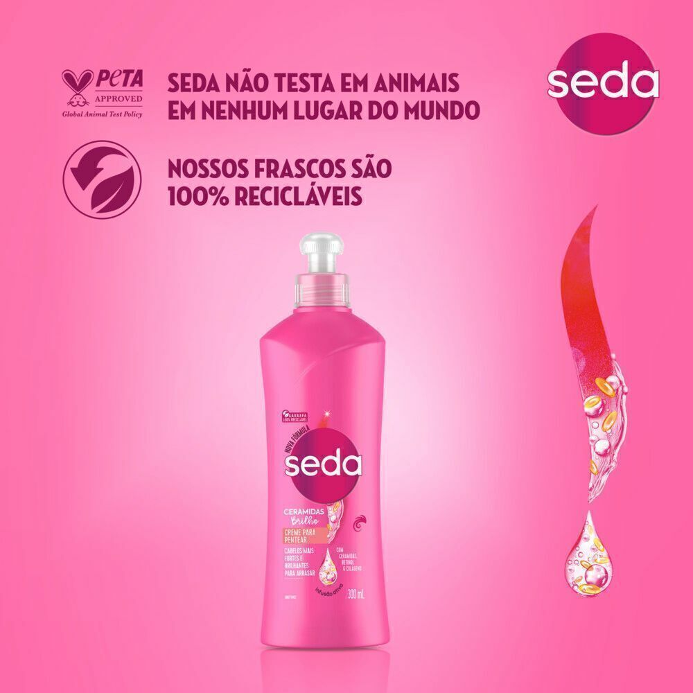 A vida é cheia de possibilidades - tenha um cabelo incrível para todas elas. Está pronta para conhecer o novo Seda? O Creme para Pentear Seda Brilho Ceramidas com Infusão Ativa tem uma poderosa combinação de vitamina, óleo e proteína, desenvolvido para as necessidades do seu cabelo. A fórmula contém Retinol, conhecido por ajudar no crescimento saudável dos fios, Ceramidas, conhecida por fortalecer o cabelo, e Colágeno, conhecido por suas propriedades hidratantes que deixam os fios alinhados e macios. Nossa fórmula possui ingredientes poderosos, garantindo nutrição capilar da raiz às pontas, deixando os fios até 5x mais fortes, com brilho e hidratação todos os dias*. O Creme para Pentear Seda Brilho Ceramidas é indicado para cabelos normais a levemente danificados, podendo ser usado diariamente. Pronta? Aplique sobre o cabelo úmido. Não necessita enxágue. Pentear e dar forma como de costume. Para o cabelo ainda mais incrível, que tal combinar com o uso do Shampoo Seda Ceramidas e do Tratamento Condicionador Seda Ceramidas? A garrafa do Creme para pentear Seda Brilho Ceramidas é feita com plástico 100% reciclável. Seda também possui a certificação PETA, o que garante que Seda não testa em animais. *com uso da linha completa Seda Ceramidas comparado com shampoo sem agentes condicionantes.