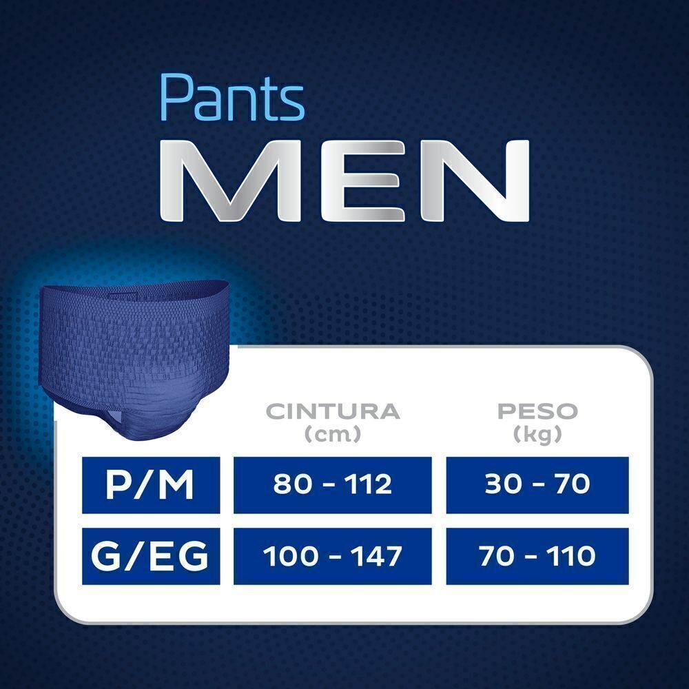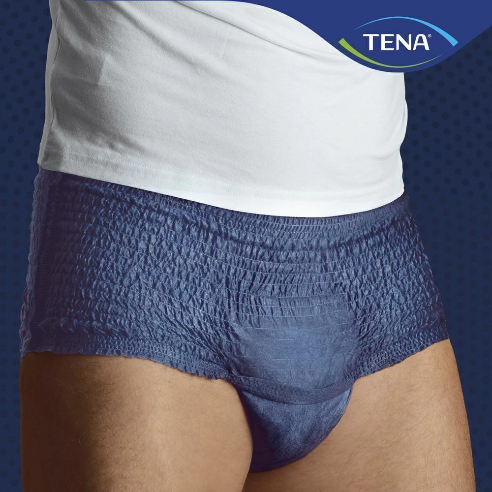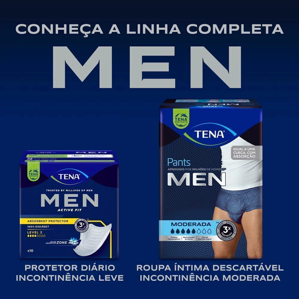 TENA Pants MEN é uma roupa íntima descartável que veste como cueca, desenvolvida especialmente para homens com incontinência urinária moderada que buscam conforto, discrição, segurança contra vazamentos e manter o cuidado com a pele. Possui neutralizador de odor e uma zona de absorção segura, formato anatômico que se ajusta perfeitamente ao corpo proporcionando conforto, facilidade de uso e discrição. A segurança deve-se especialmente à uma zona de absorção frontal que absorve rapidamente a urina, mantendo-a longe da pele e assim, deixando-a seca, auxiliando a reduzir o risco de irritações ou infecções cutâneas.TENA Pants MEN é ideal para homens ativos, discreto como uma cueca, com controle de odor e alta absorção.