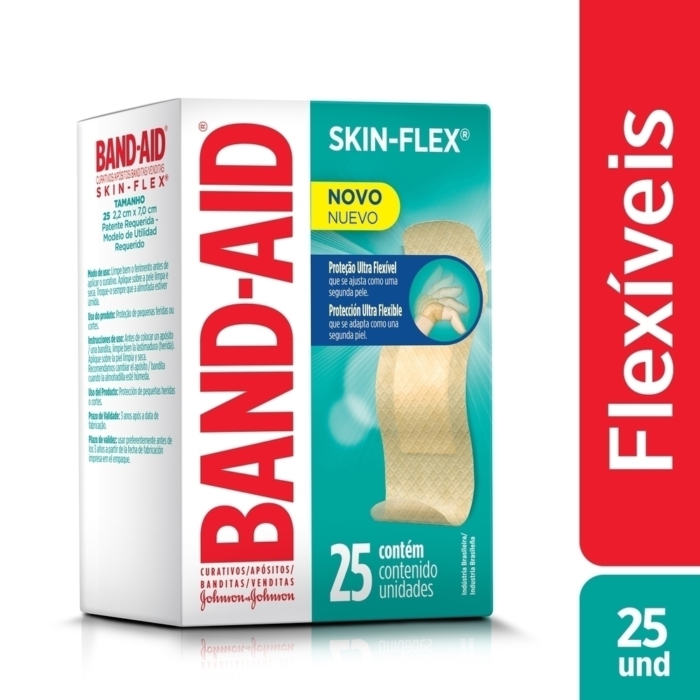 O BAND AID® Skin Flex é um curativo flexível projetado para se mover como uma segunda pele, proporcionando flexibilidade, conforto, secagem rápida e retenção por até 24 horas. É indicado para proteger pequenas feridas, arranhões, machucados ou cortes. O machucado coberto com o BAND AID® Skin Flex cura mais rapidamente* e ajuda a proteger contra sujeira e germes que podem causar infecção. Disponível nas versões Regular 25 Unidades e Variados 20 Unidades.*vs ferida descoberta