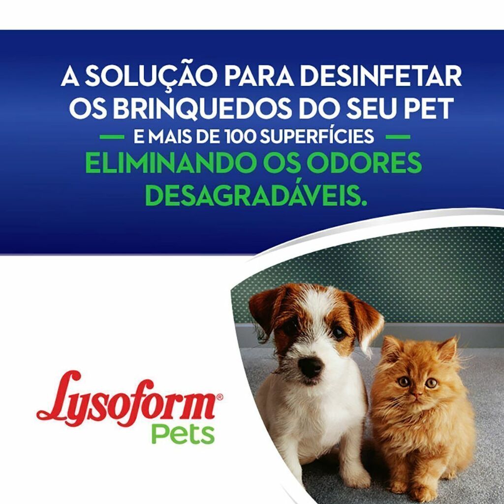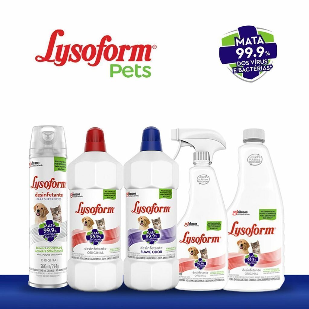 Lysoform Pets é uma linha de produtos desinfetantes, recomendada por veterinários para desinfetar diversas superfícies da sua casa, ajudando a proteger seus pets e sua família. Os produtos da linha matam 99.9% dos vírus e bactérias presentes nas superfícies, inclusive os que causam a Cinomose, a Gripe Canina, a Tosse Canina e Calicivirose Felina, além de eliminar odores causados por animais domésticos nos ambientes. Para que você e toda a família, inclusive seus pets, possam aproveitar cada momento.