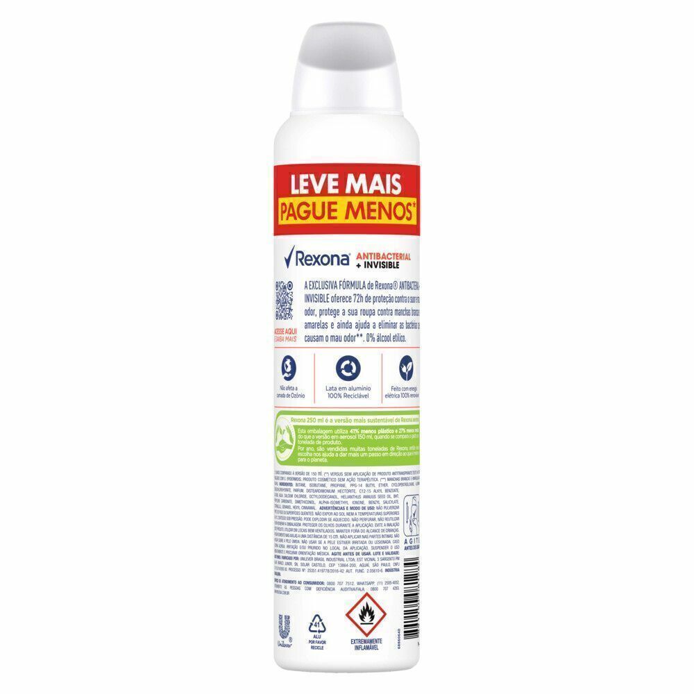 o O Desodorante Antitranspirante Aerosol Feminino Rexona Antibacterial+Invisible possui nova fórmula: 72 horas de proteção contra a transpiração e o mau odor, ativada pelo movimento o O novo desodorante feminino Rexona responde diretamente ao seu movimento, mantendo você seca, fresca e protegida como nunca o A tecnologia do Desodorante Antitranspirante Aerosol Feminino Rexona Antibacterial+Invisible protege a roupa contra manchas brancas e amarelas e ajuda a eliminar as bactérias que causam o mau odor o A fórmula do Antitranspirante Aerosol Feminino Rexona Antibacterial+Invisible é 0% álcool* o Agite antes de usar. Aplicar o Desodorante Feminino Rexona Antibacterial+Invisible somente nas axilas a não menos de 15 cm da pele o Este desodorante antitranspirante não afeta a camada de ozônio, possui lata em alumínio 100% reciclável e é feito com energia elétrica 100% renovável